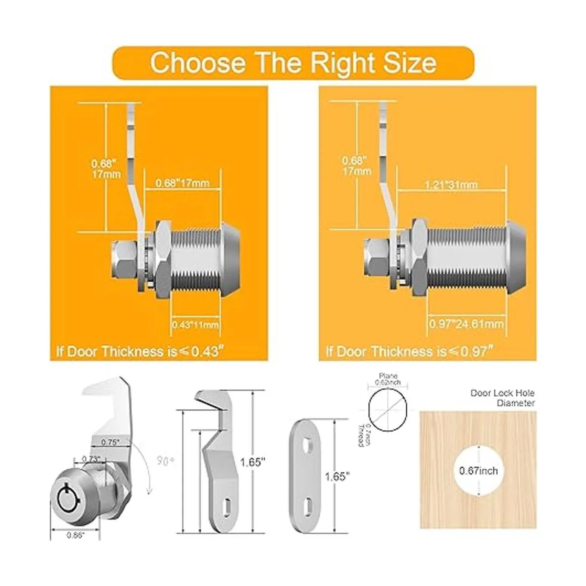 Comprueba tus tamaños: las cerraduras tubulares de leva son adecuadas para diferentes grosores de paneles de puerta. Antes de comprar, comprueba la introducción de tallas en la figura 2 y elige el tamaño correcto Longitud del cuerpo de las cerraduras de leva: 0.669 in, grosor de la puerta 0.433 in, diámetro del agujero de la cerradura: 0.748 in, placa de bloqueo: 1.654 in, ajuste perfecto para cerraduras de repuesto de caja de herramientas, cerraduras de gabinete de buzón, almacenamiento de RV y puerta de compartimento.