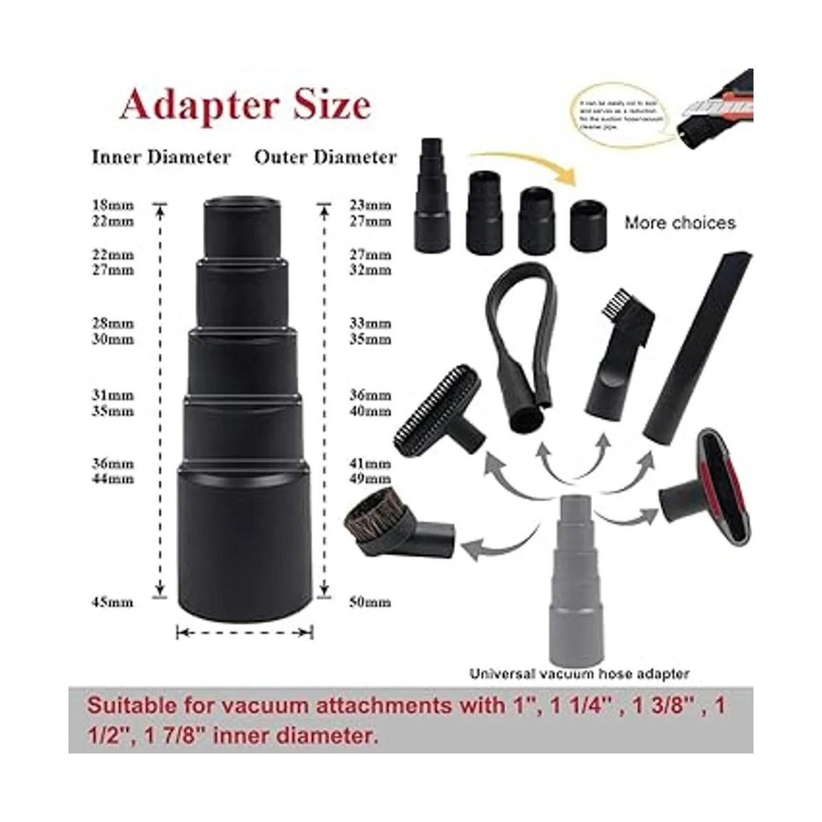Adaptador de vacío universal de 5 capas: el diámetro exterior del adaptador de 5 capas es de 0.906 in, 1.063 in, 1.260 in, 1.378 in, 1.575 in, 1.969 in. Adecuado para accesorios de aspiradora de tienda con 1.000 in, 1.260 in, 1.378 in, 1.535 in, 1.929 in. El adaptador de vacío se puede cortar fácilmente en un conector de 5 tamaños para tus necesidades.