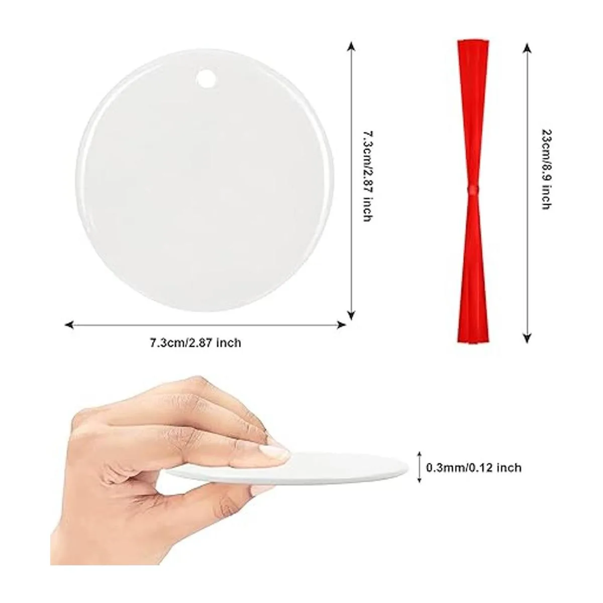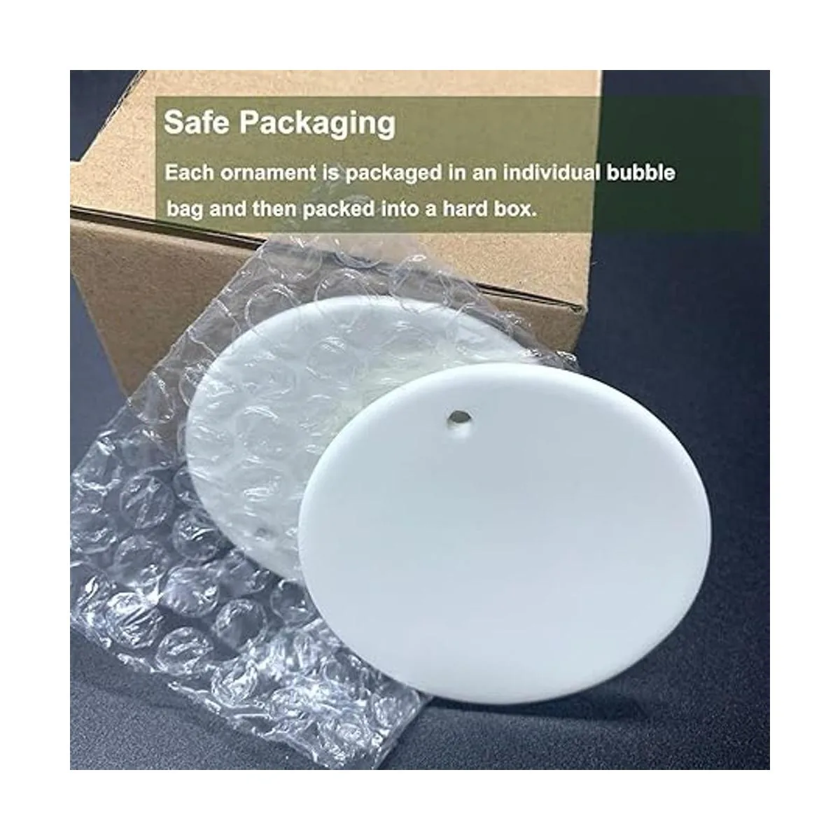 Material de calidad: los espacios en blanco de sublimación están hechos de porcelana plana redonda blanca, fuerte y resistente, no es fácil de romper, la superficie de cerámica es brillante y lisa, cada adorno de cerámica en blanco viene con un agujero, que es conveniente para que lo cuelgues en el lugar que desees, puedes sublimar tu imagen favorita y texto en él para decorar el árbol de Navidad, hacer que tu árbol de Navidad se vea más delicado