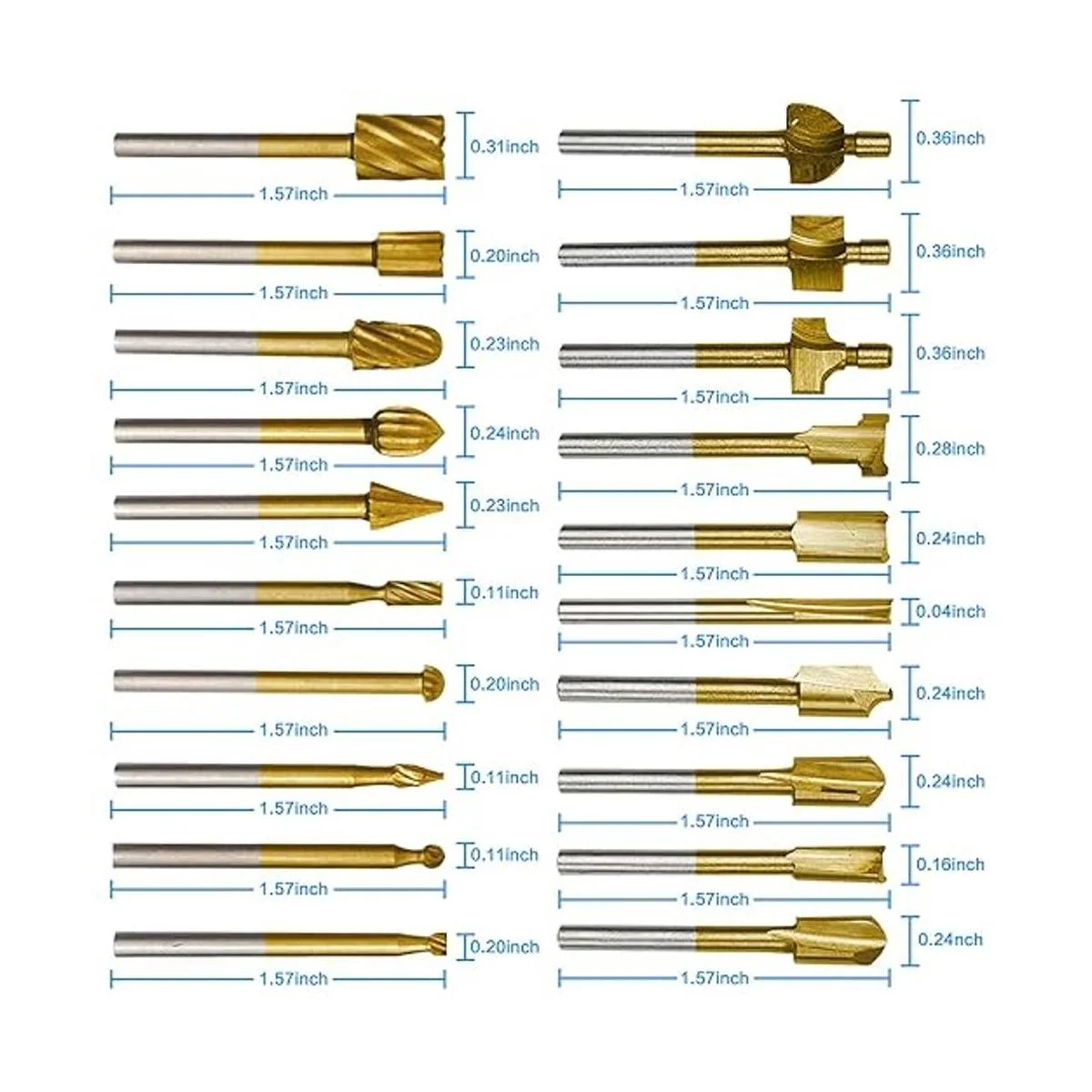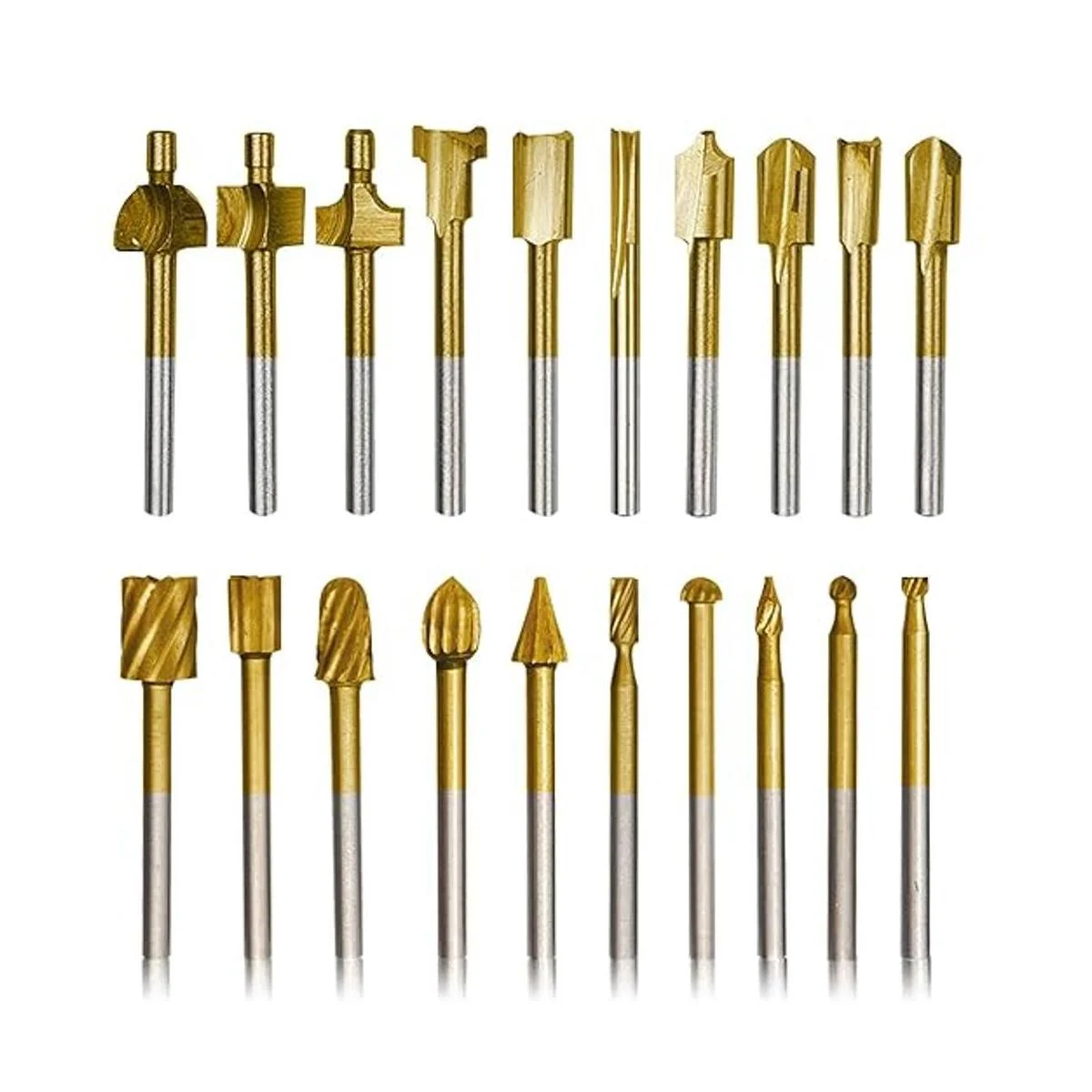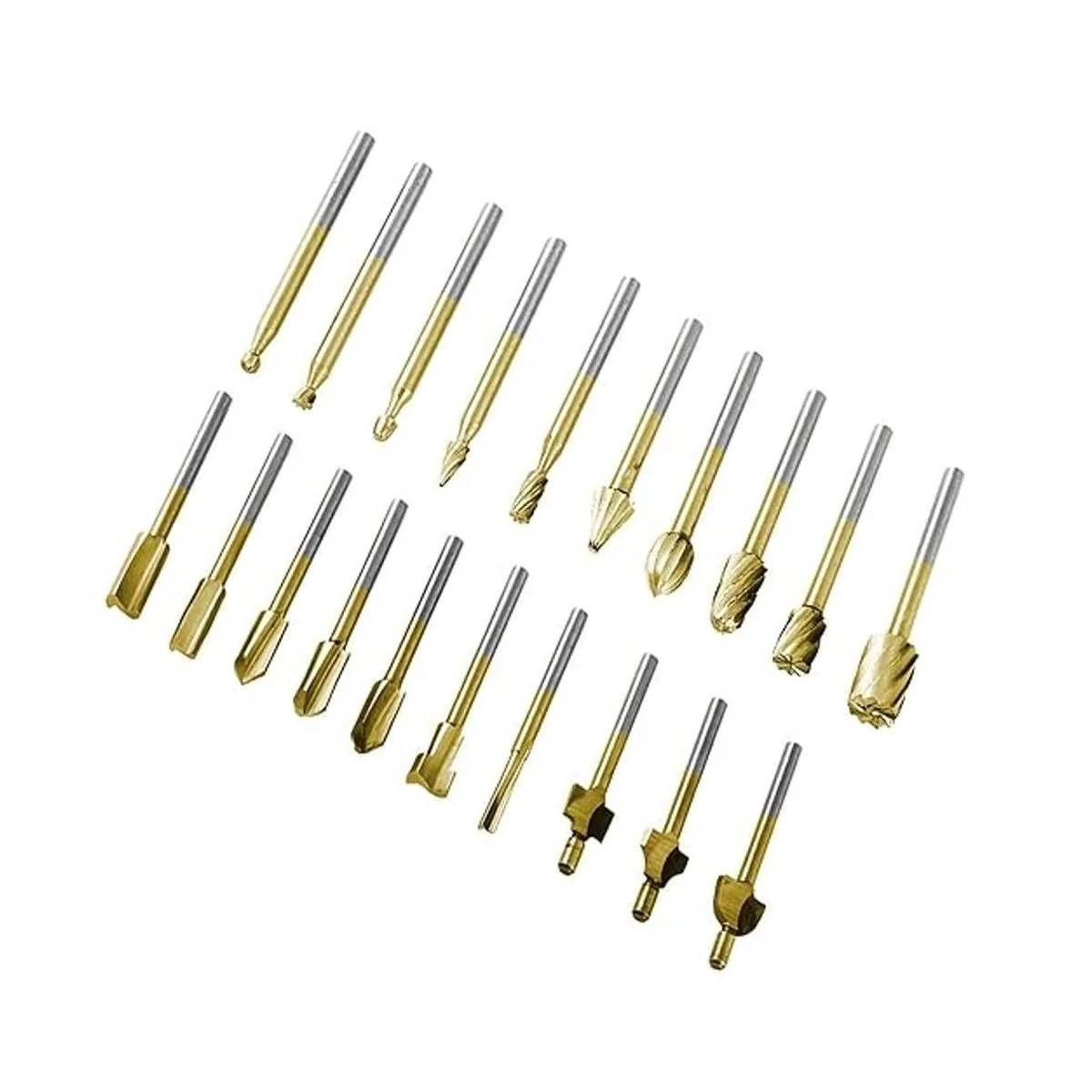 20 puntas diferentes: viene con 20 piezas de los tipos de brocas más útiles, incluyendo recto, recorte, ranura en V, cuentas, cala, cortador de ranuras y más para satisfacer tus necesidades en tallado detallado.