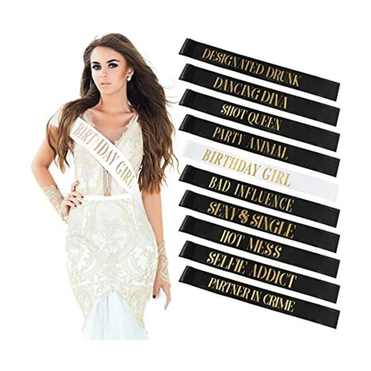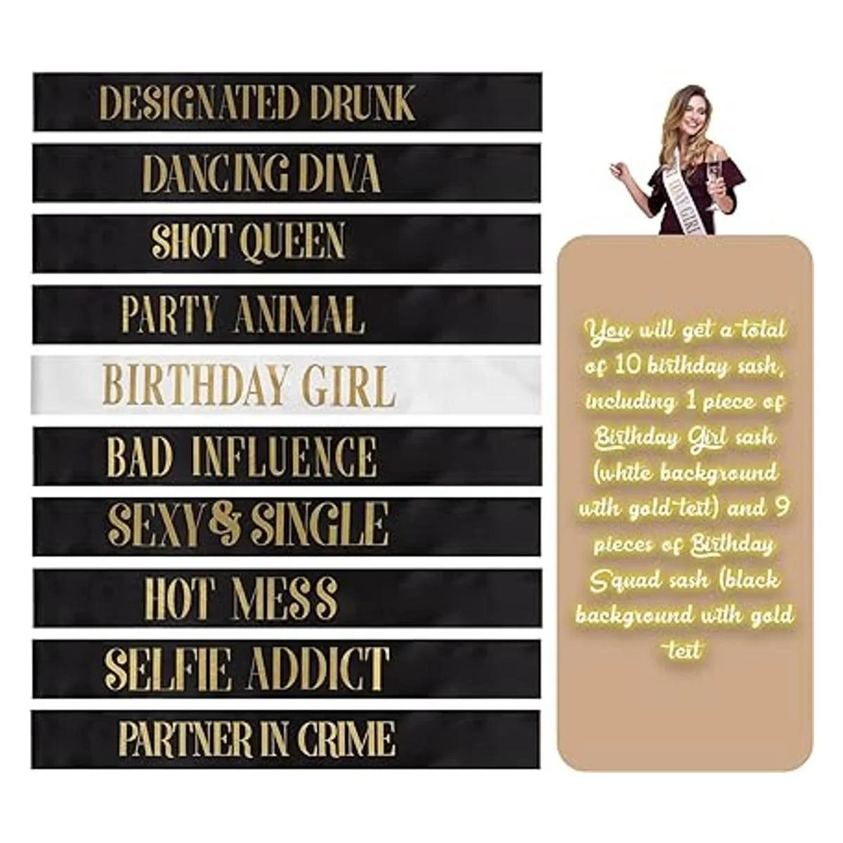 10 piezas de banda de cumpleaños para mujeres, suministros de fiesta de cumpleaños, banda de cumpleaños para niñas, banda de cumpleaños dorada, 2 colores negro, blanco