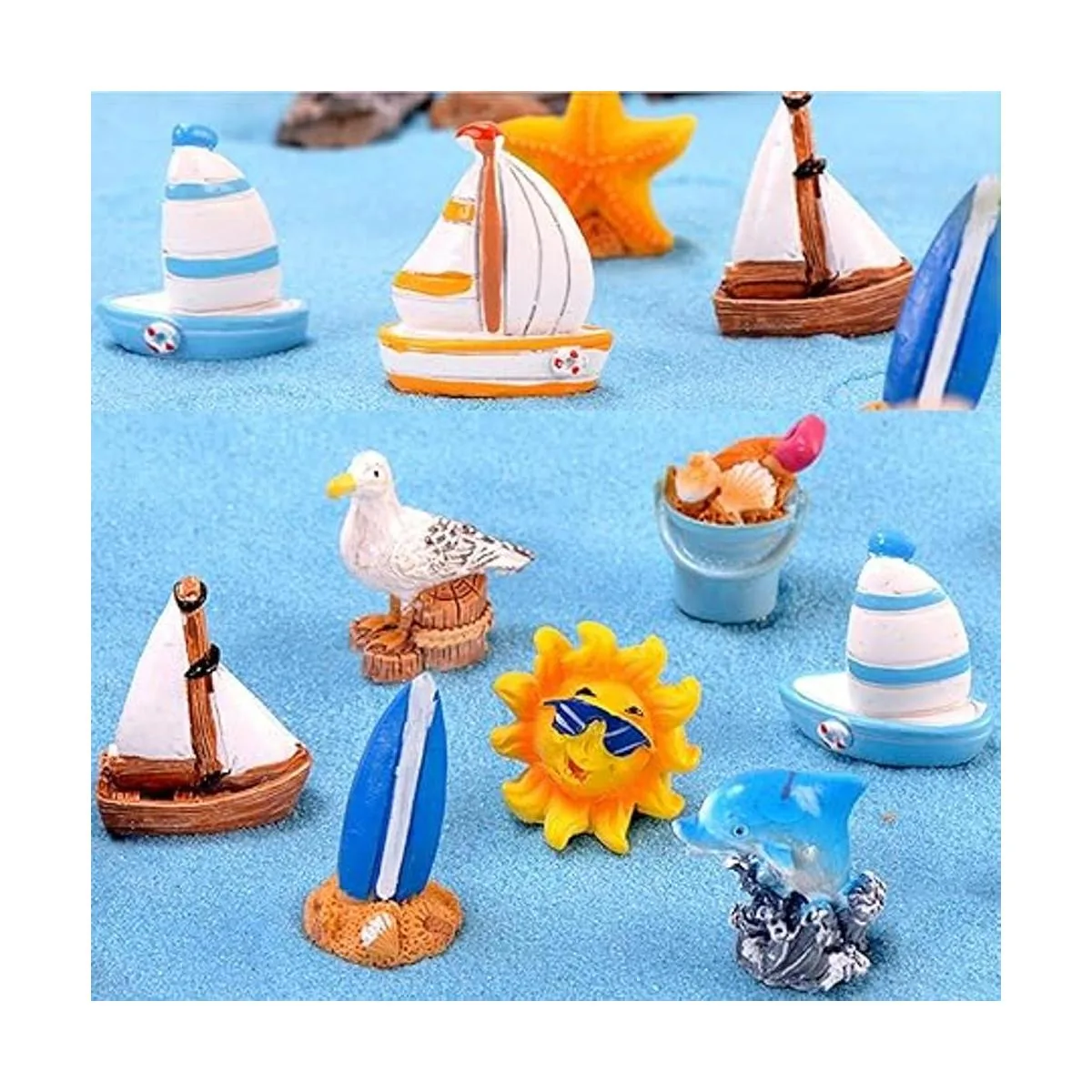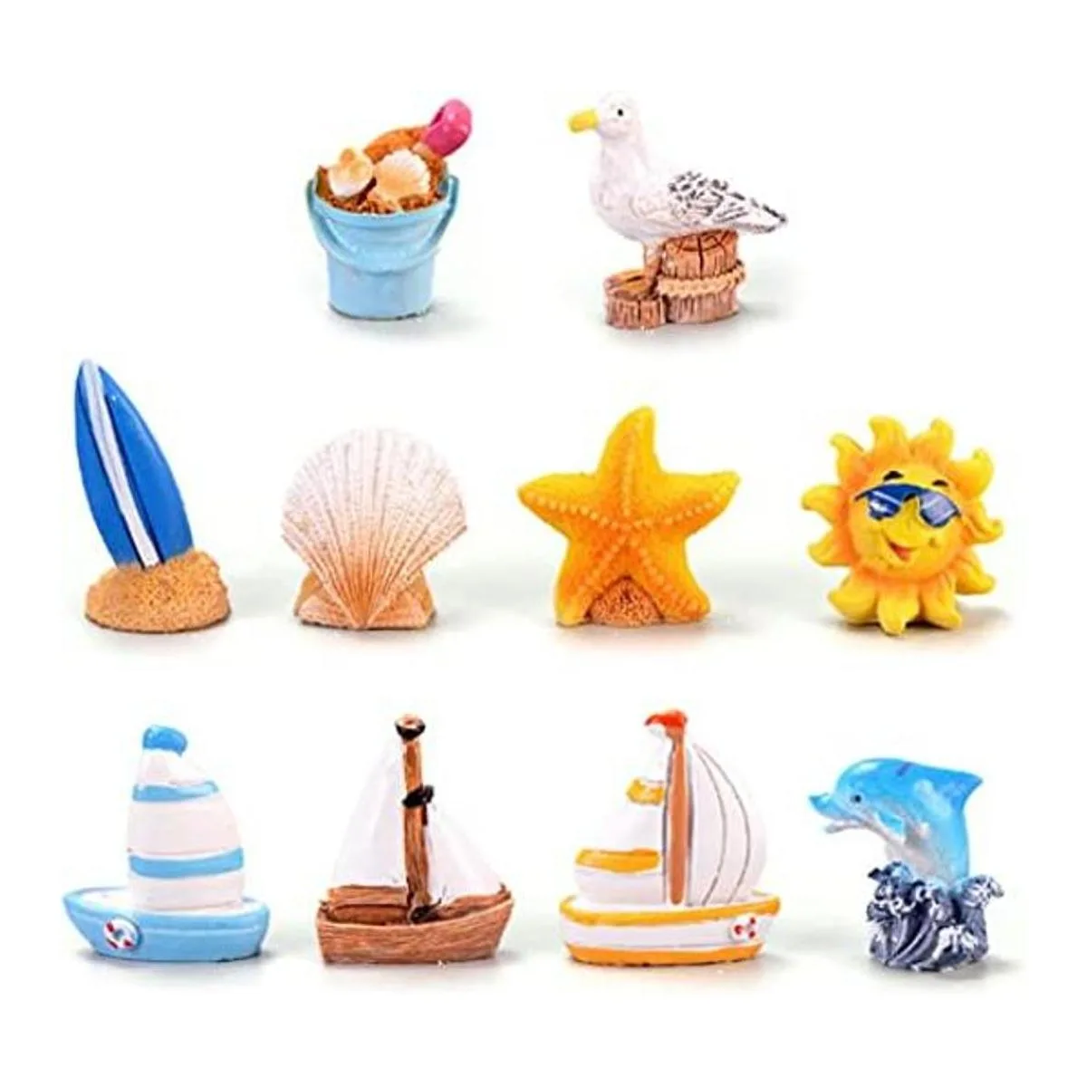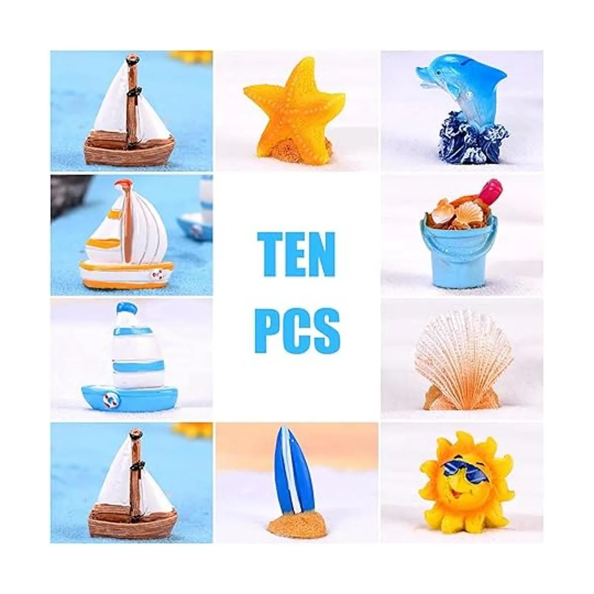 10 piezas de figuras de jardín de hadas, accesorios en miniatura, concha de mar, delfín, estrella de mar, velero, playa, cubo, decoración, mini escena marina, kit de decoración de bricolaje
