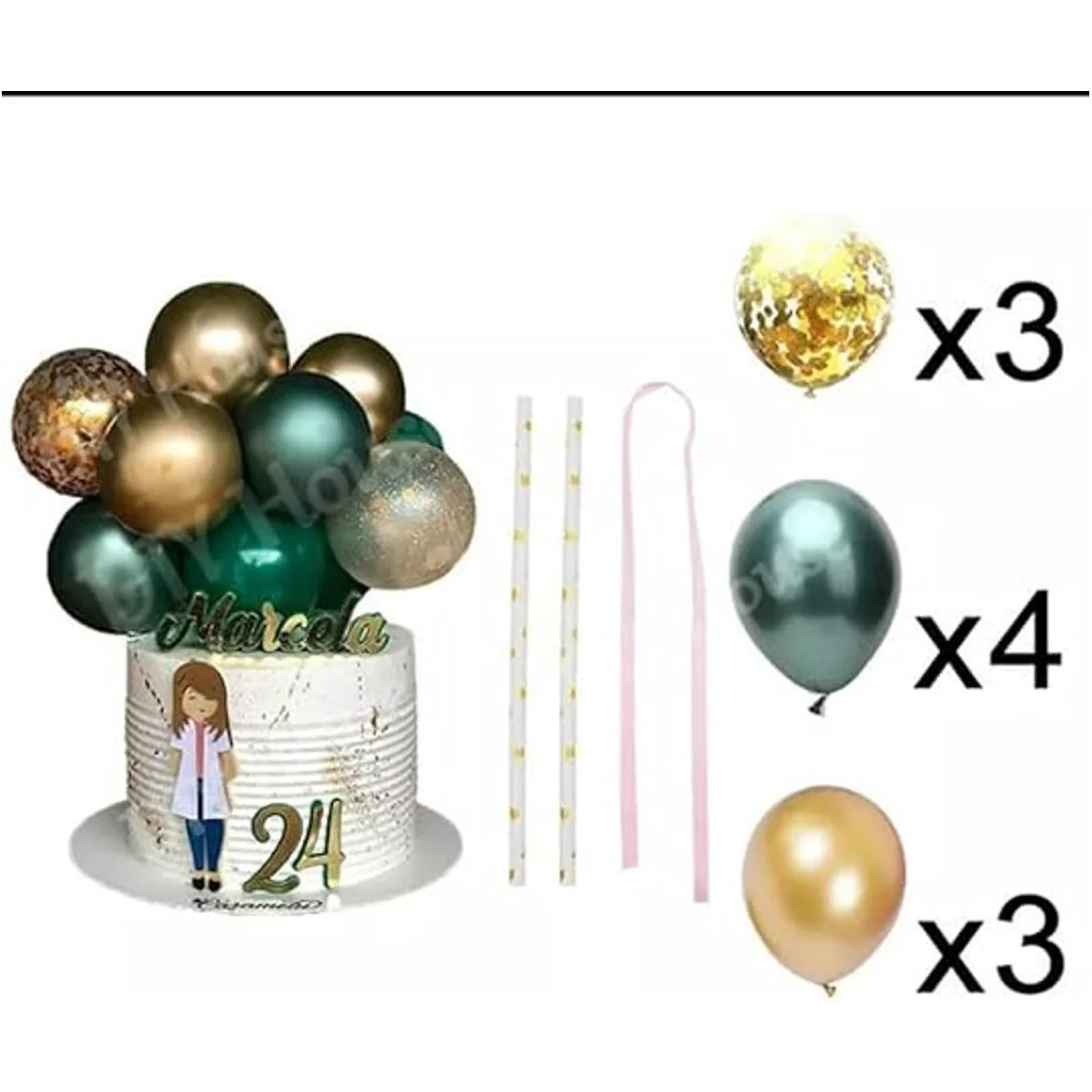 El paquete incluye: 4 globos de látex verde, 3 globos de látex dorado metálico, 3 globos de látex de confeti dorado, 2 pajitas de papel, 1 cinta.