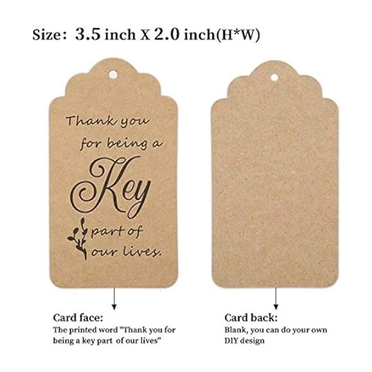 Lo que obtienes: 100 abrebotellas con llave 5 estilos, 20 unidades para cada uno, 100 tarjetas de agradecimiento y 100 llaveros de acero inoxidable. 2 rollos de cuerda de yute. Tenemos 35 llaveros y etiquetas gratis