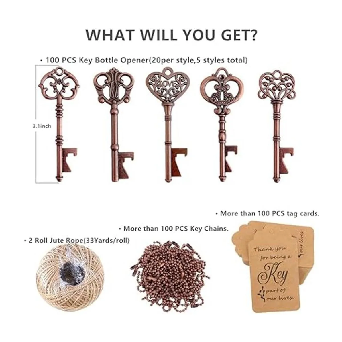 100 abridores de botellas para llaves, esqueleto vintage para recuerdos de boda, regalos de fiesta de boda, recuerdos de decoración para invitados, recuerdos de despedida de soltera, a granel cobre rojo