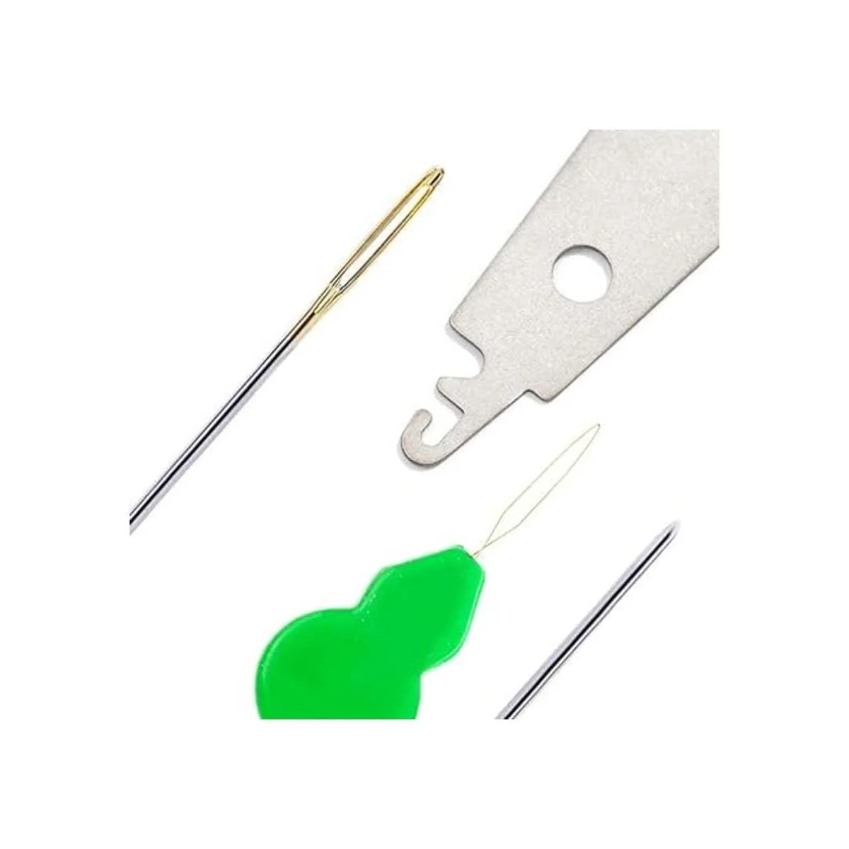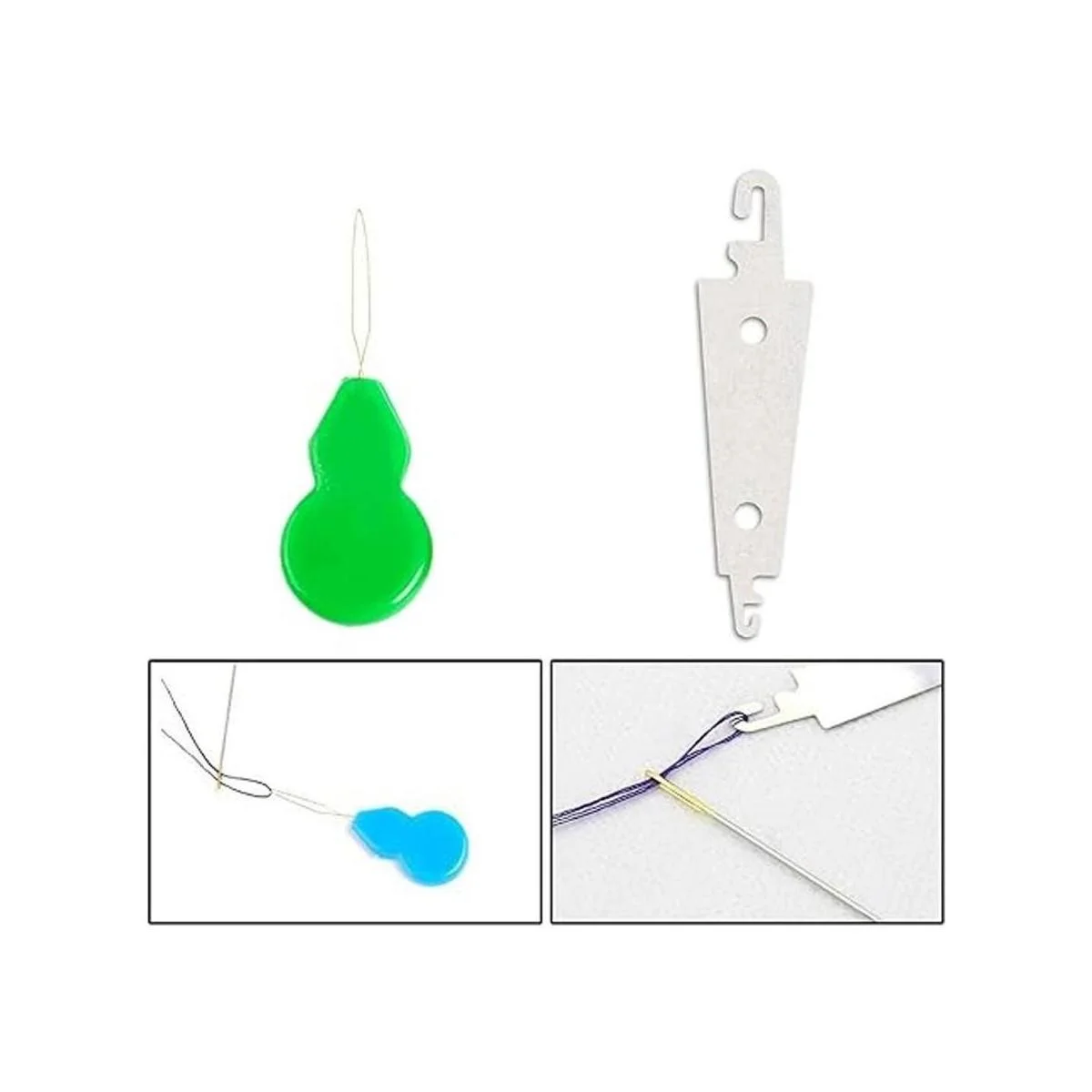 Incluye: 100 agujas de punto de cruz 22 en una botella, 1 enhebrador de agujas de acero inoxidable y 1 enhebrador de agujas de plástico en forma de calabaza color aleatorio.