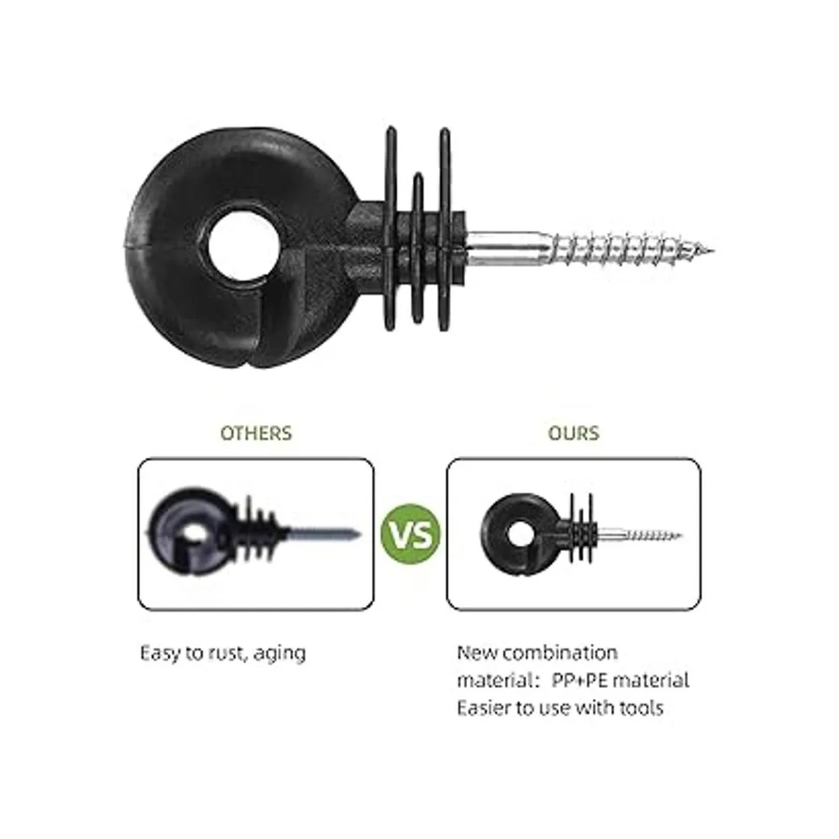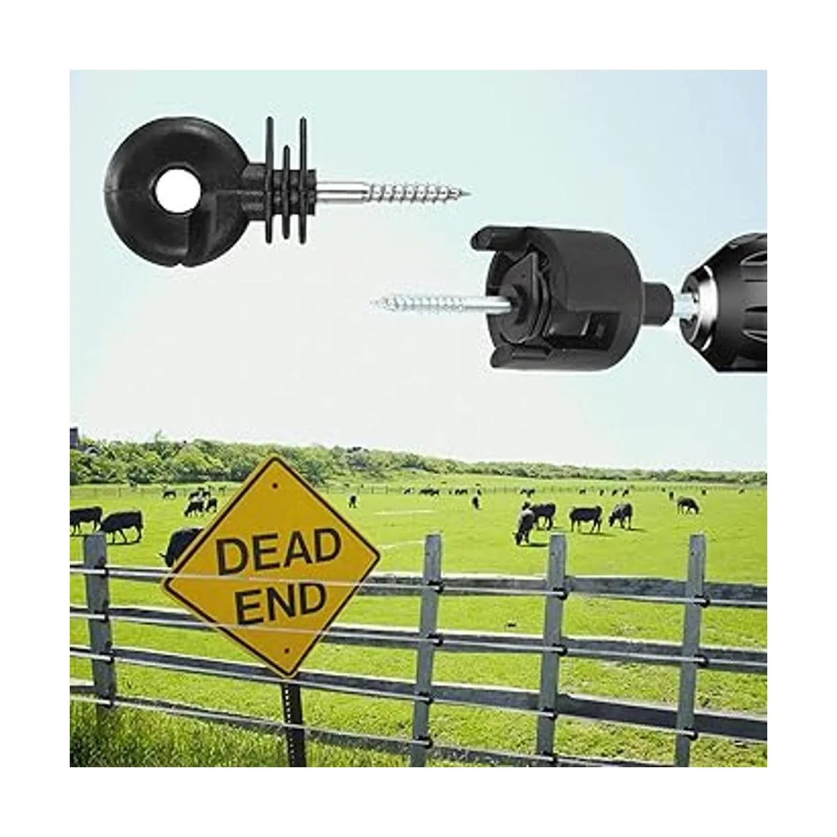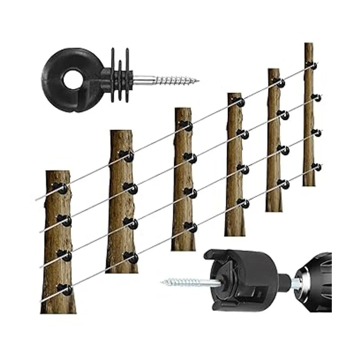 100 aisladores de valla eléctrica color negro atornillados con poste de madera y 1 herramienta de enchufe aislante libre accesorios de sistema de rejilla para cría de animales electrónicos