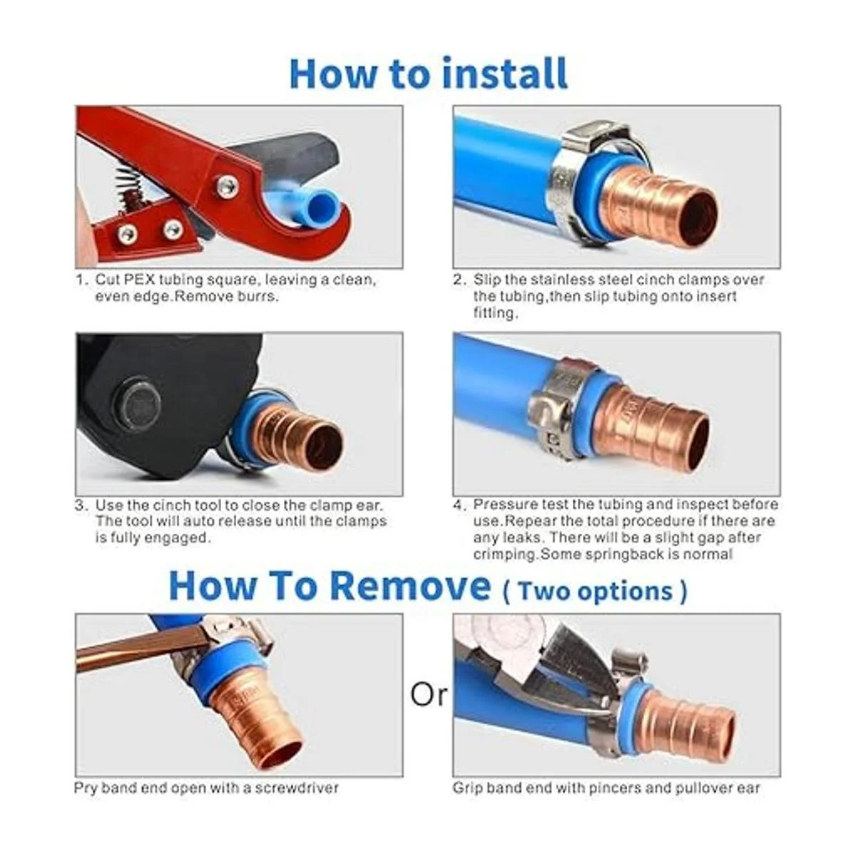 Fácil instalación Los anillos de abrazadera Pex deslizan el 3/4 pulgadas. anillo de abrazadera sobre el tubo, empuja el tubo en el accesorio y aprieta con tu herramienta de abrazadera para hacer una conexión segura.
