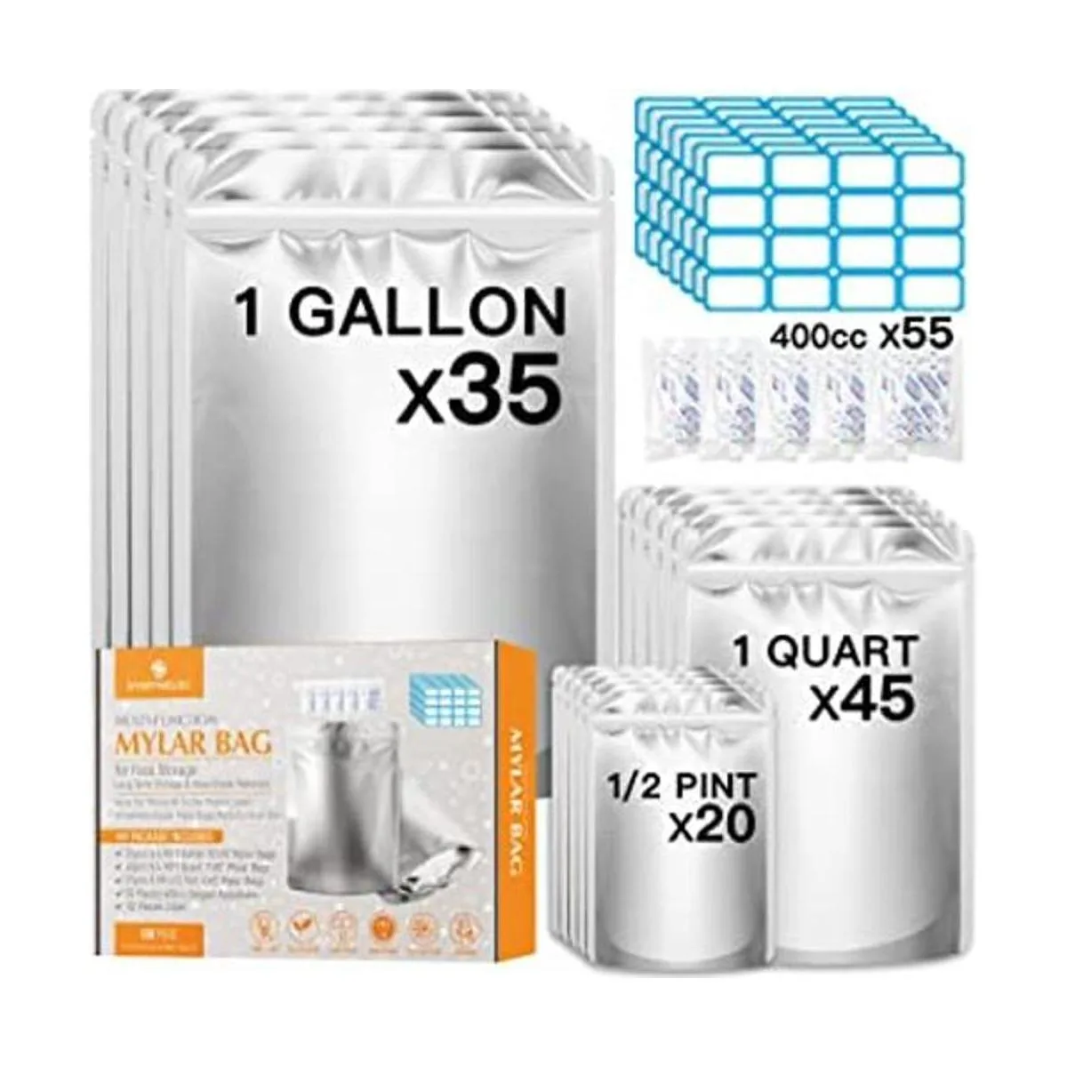Valor por dinero todo en uno: incluye: 35 bolsas de mylar de tamaño grande de 1 galón de 10.2 x 13.8 pulgadas, 45 bolsas de mylar de tamaño mediano de 7.1 x 10.2 pulgadas, 20 bolsas de mylar de tamaño pequeño de 1/2 pinta de 4.3 x 6.3 pulgadas. Viene con 55 absorbentes de oxígeno sellados individualmente y 100 laboratorios para un mejor almacenamiento y diferenciación de alimentos, reduciendo el mal manejo y los residuos.