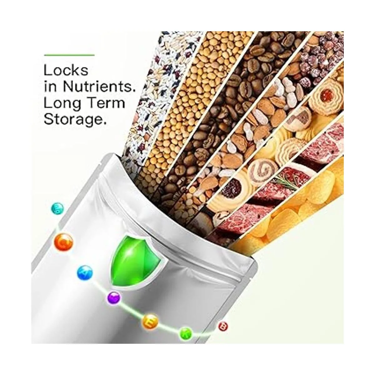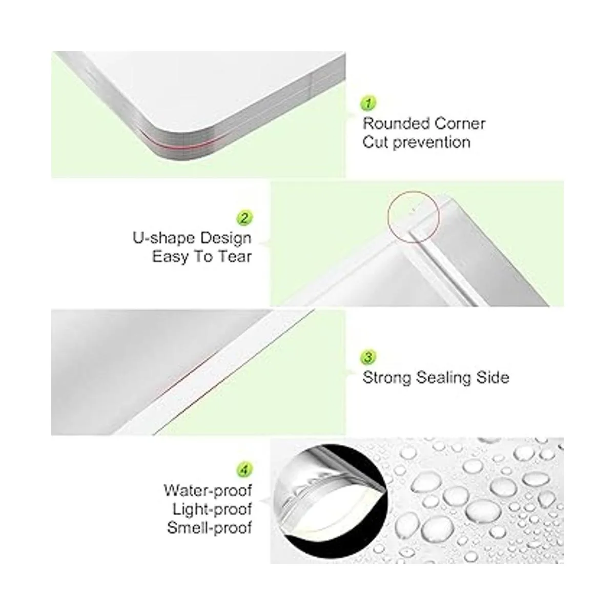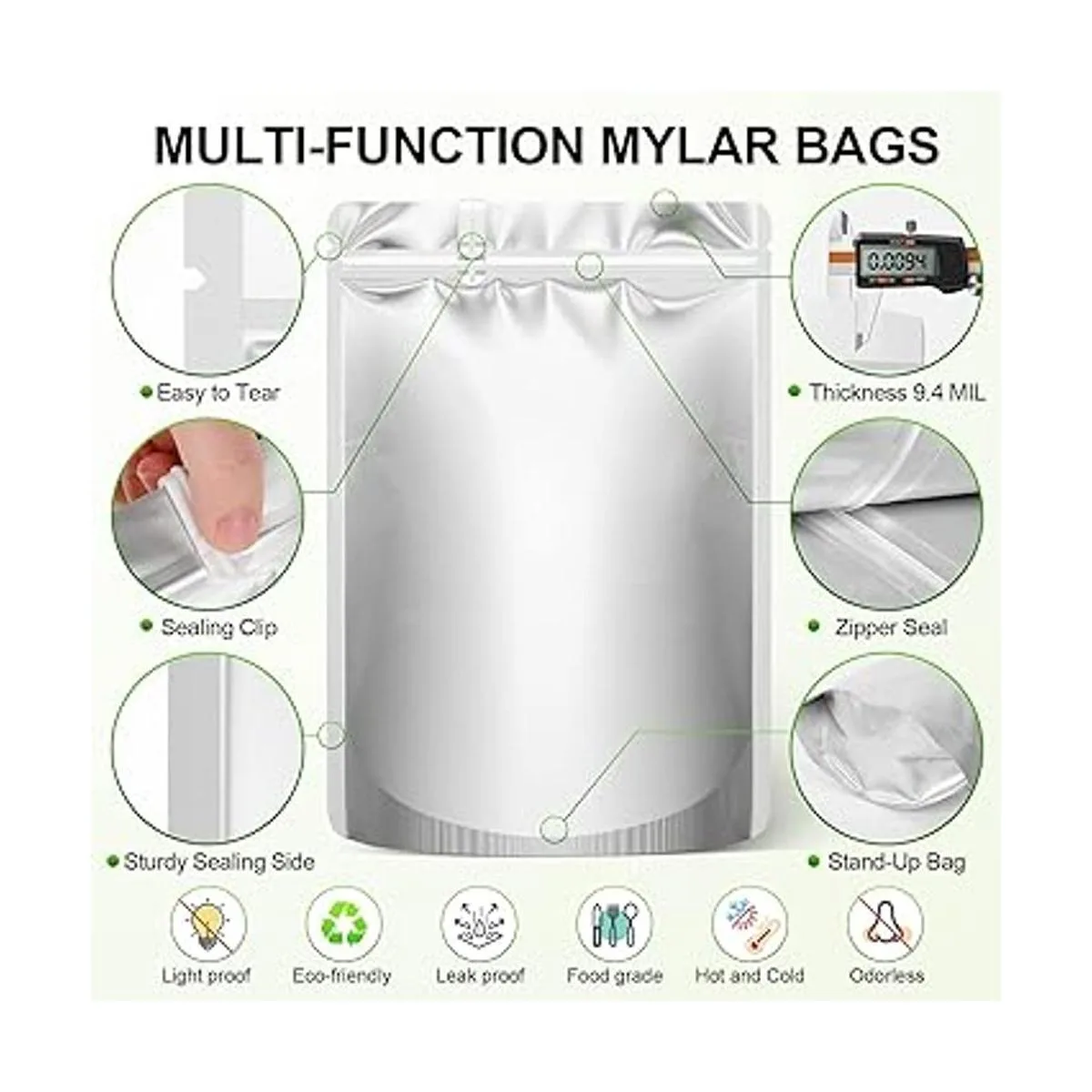 Almacenamiento a largo plazo y materiales de grado alimenticio: nuestras bolsas de mylar están hechas de material de grado alimenticio que es seguro, ecológico, duradero e insípido. Hay tres capas en estas bolsas: PET, lámina de aluminio y PE. Nuestras bolsas de mylar pueden proteger tu comida del aire, la humedad y las plagas mientras mantienen su sabor y valor nutricional.