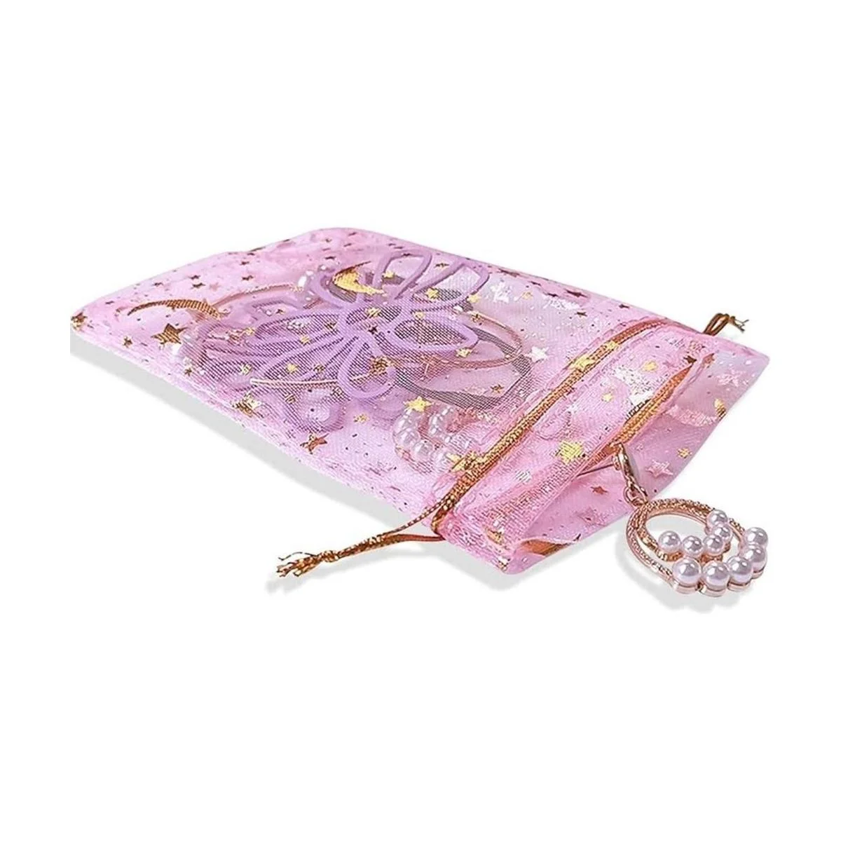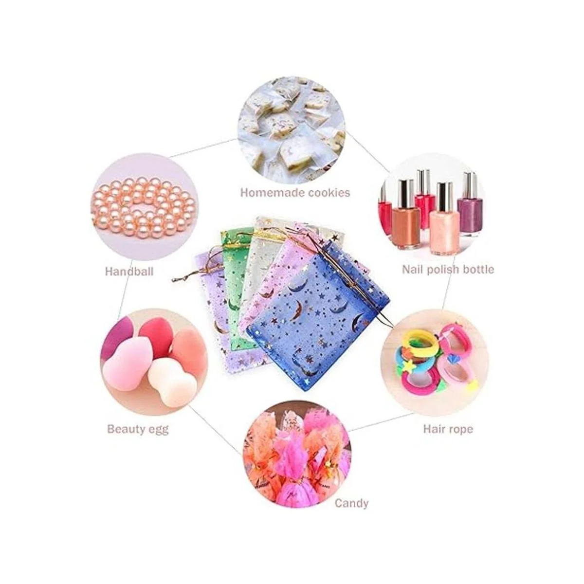 Las puntadas de estas bolsas de organza están ordenadas y cerradas, tela de organza de calidad con cintas de satén con estampado de estrellas y lunas.