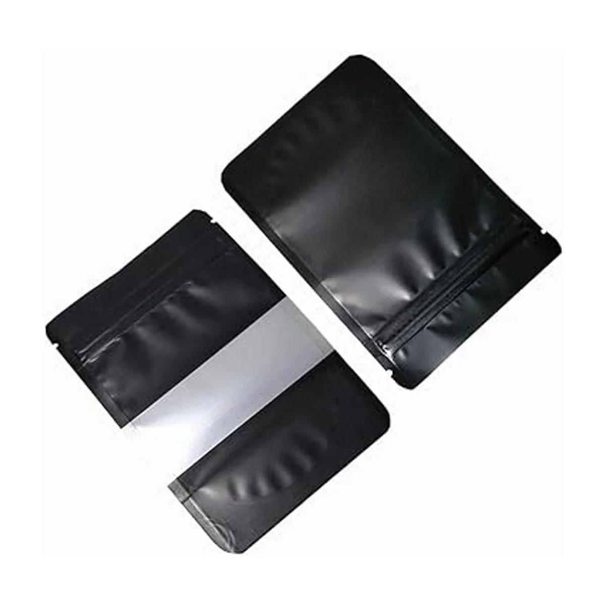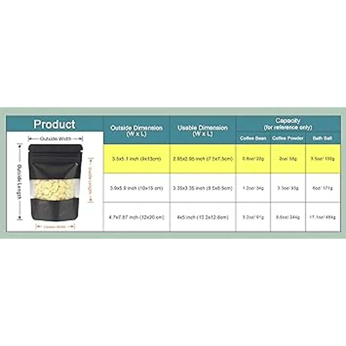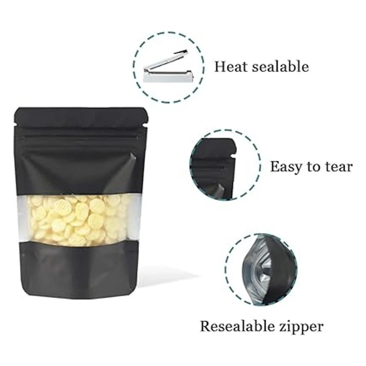 100 bolsas de pie resellables de 3.5 x 5.1 pulgadas, color negro mate con sellado térmico para ventana, bolsas de papel de aluminio para almacenamiento de alimentos a granel