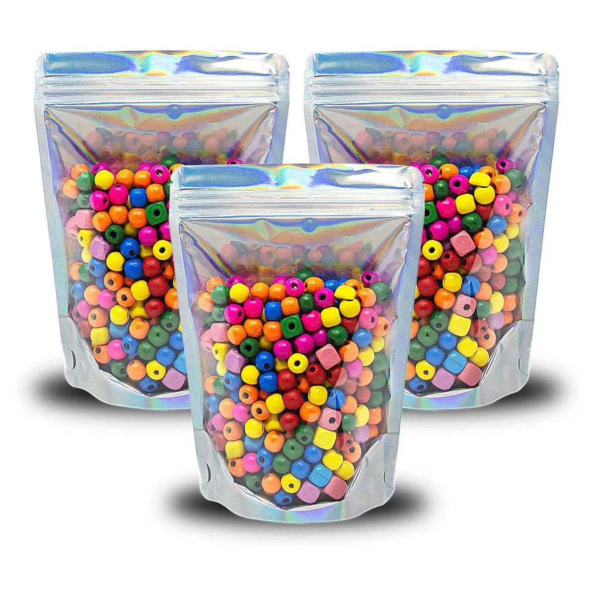 Contenido: 100 bolsas individuales. Bolsas iridiscentes con ventana frontal transparente para mostrar claramente el contenido. Cierra las bolsas con sellado térmico o cremallera. Muesca de desgarro para abrir fácilmente el sellado térmico. La base reforzada se expande a 2.5 pulgadas, lo que permite que la bolsa se mantenga de pie por sí sola, sin esfuerzo de llenar. Las bolsas vienen en su propia bolsa superior con cremallera, lo que permite un fácil almacenamiento y reutilización.
