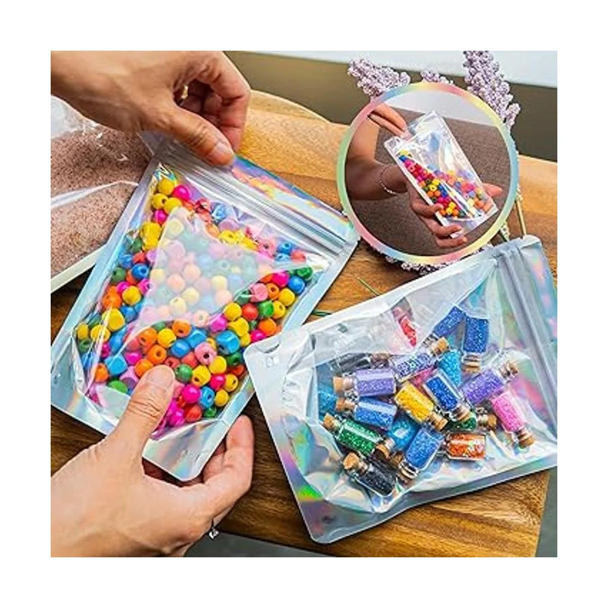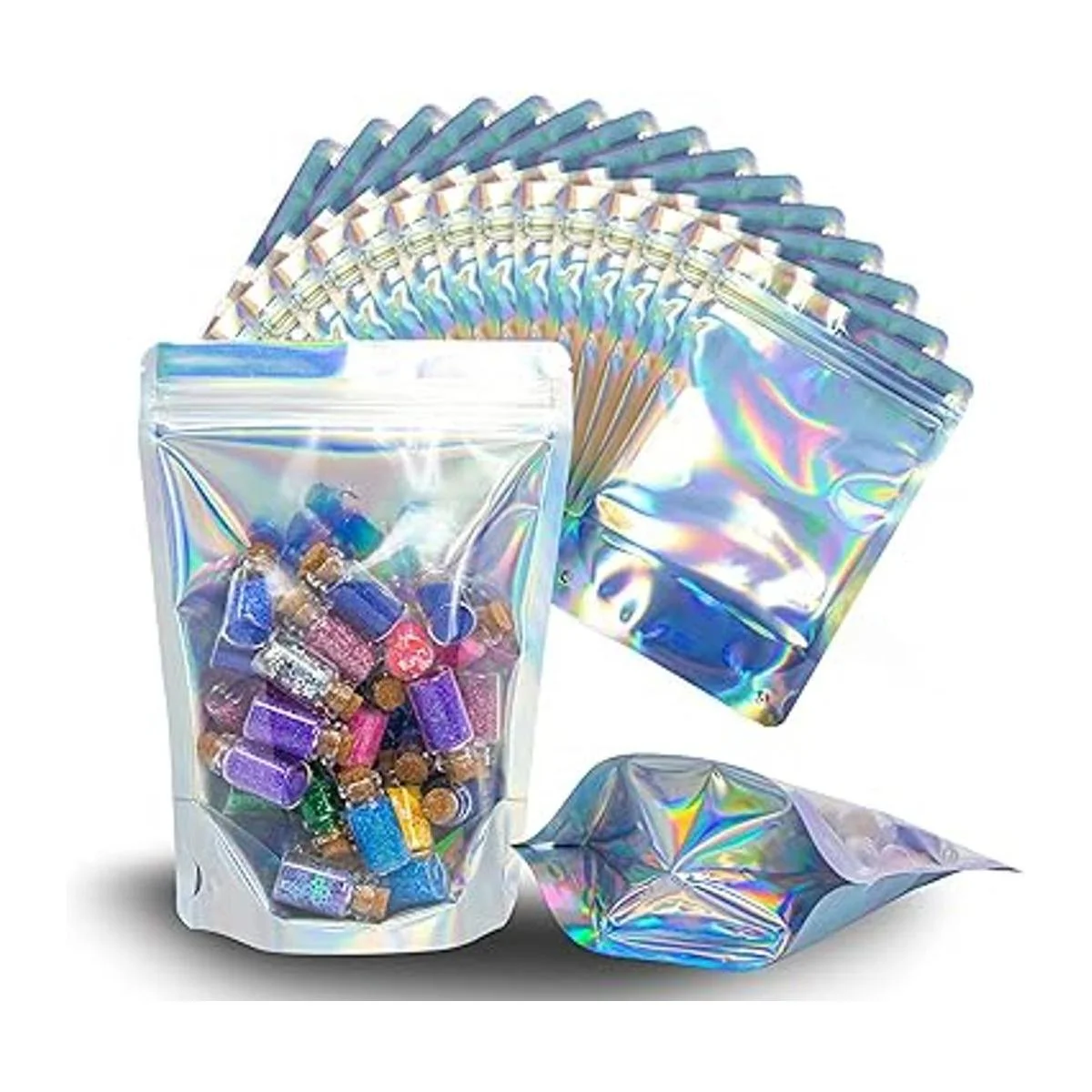 100 bolsas holográficas de Mylar resellables 5 x 7 pulgadas a prueba de olores Bolsas de pie con cierre hermético y termosellables Uso para recuerdos de fiesta Embalaje de brillo de labios Muestra para pequeñas empresas WaldOaks