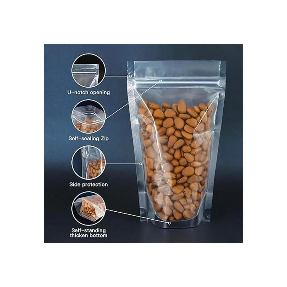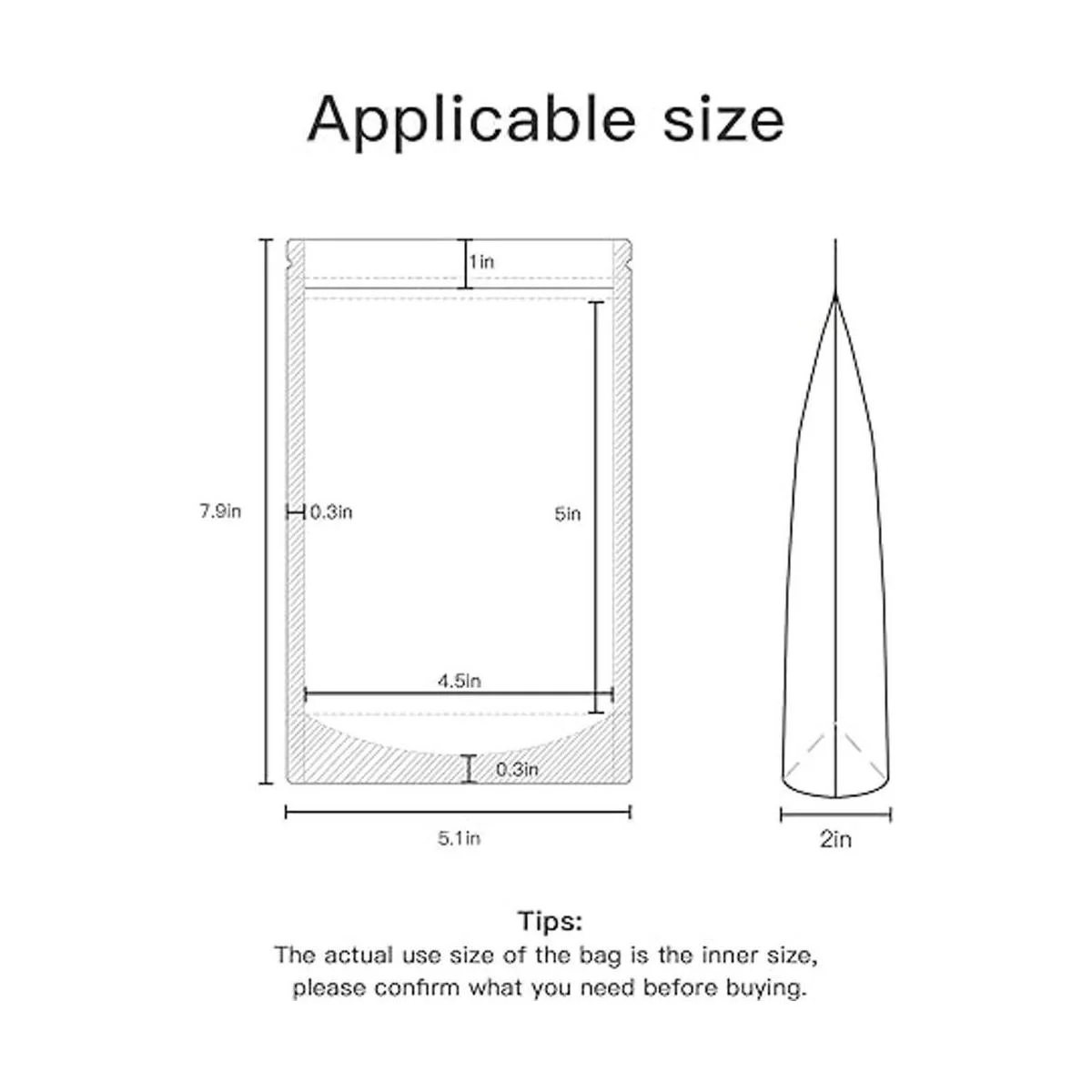Cantidad y material: el paquete incluye 100 bolsas transparentes de pie. Dimensiones exteriores: 5.1 x 7.9 pulgadas, dimensiones interiores: 4 x 5.9 pulgadas; hecho de plástico de grado alimenticio, que es inodoro, reutilizable y a prueba de humedad, mantiene tus productos frescos. Prácticas bolsas para empacar productos.
