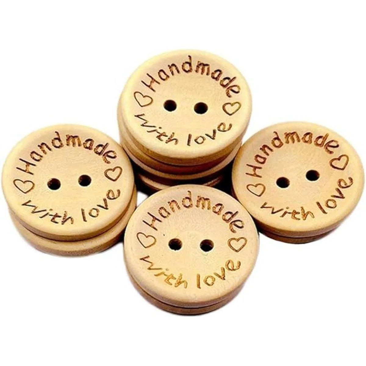 100 botones de madera hechos a mano con amor redondo botón de costura 2 agujeros manualidades botón de decoración DIY suministros de manualidades, 25MM