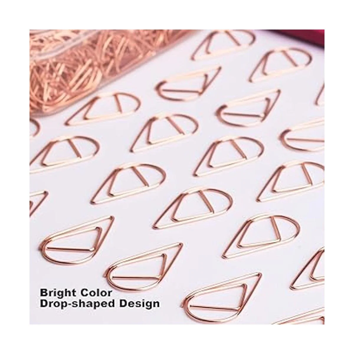 100 clips de papel en forma de gota de oro rosa en una caja de almacenamiento