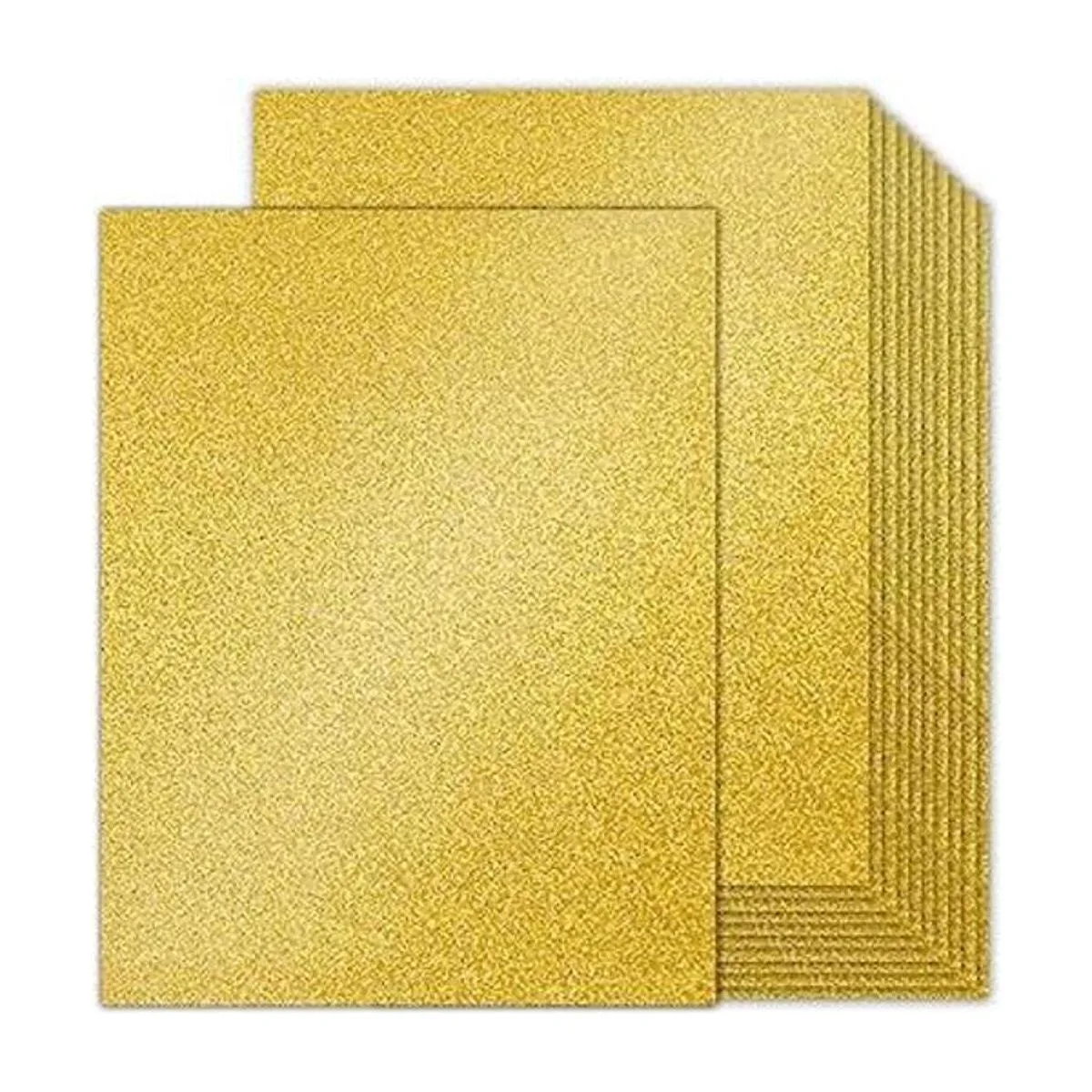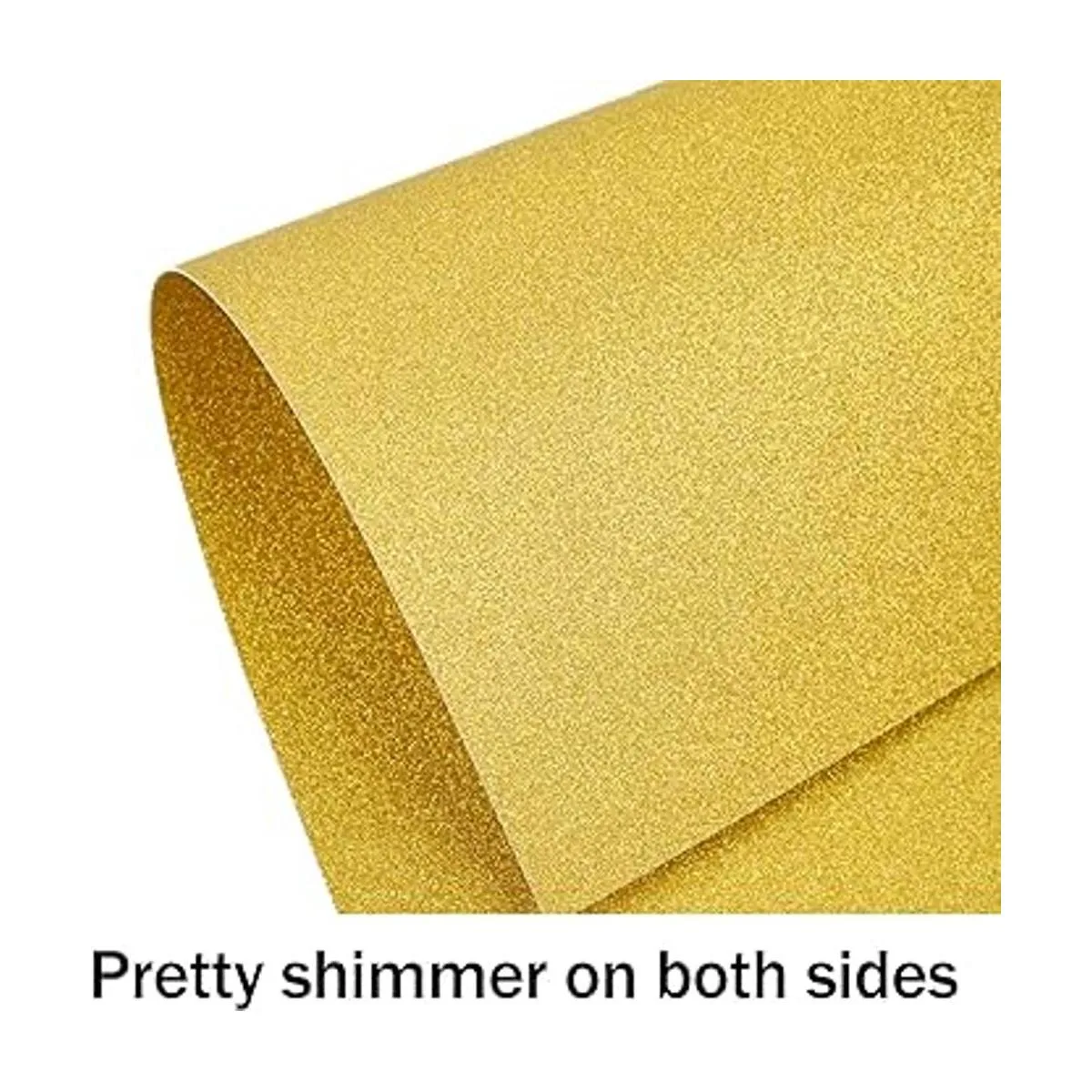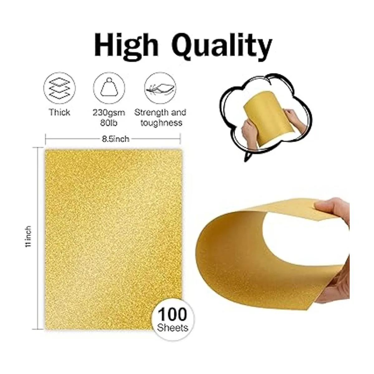 Dimensiones del papel: cada paquete incluye 100 hojas de papel de cartulina dorada con purpurina, mide 8.5 x 11 pulgadas de tamaño, 8.11 oz de peso. Doble cara, sin ácidos y respetuoso con el medio ambiente.