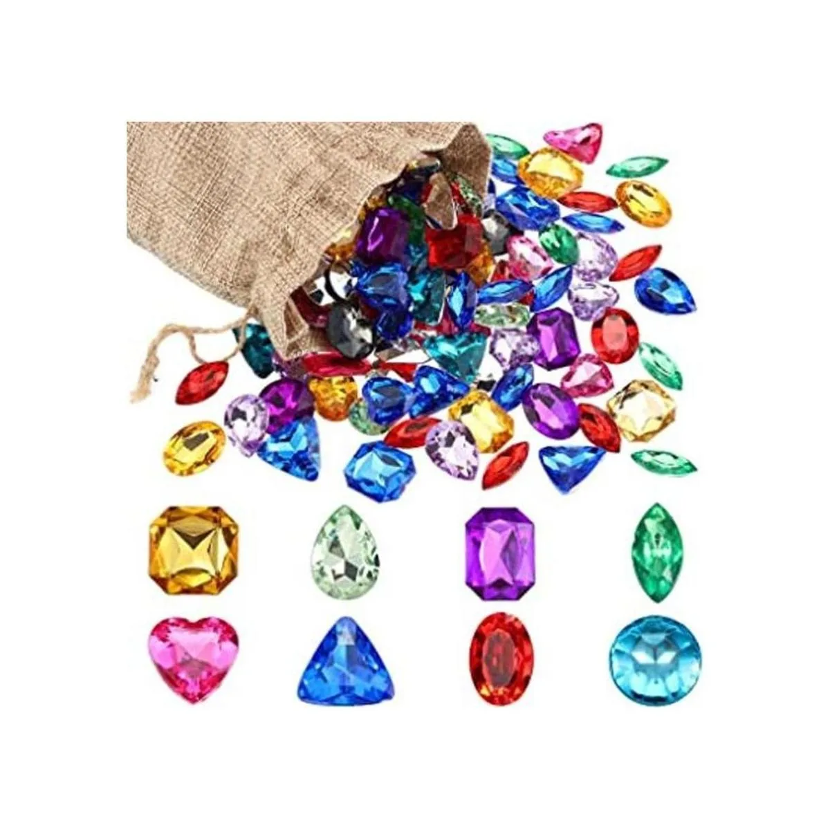 Varias formas: estas 100 piezas de joyas del tesoro están diseñadas en 8 formas diferentes, incluyendo: redondo, corazón, gota, ovalado, cuadrado, etc., el color de cada forma es aleatorio, colorido y realista, te da una mejor decoración y una experiencia divertida de fiesta