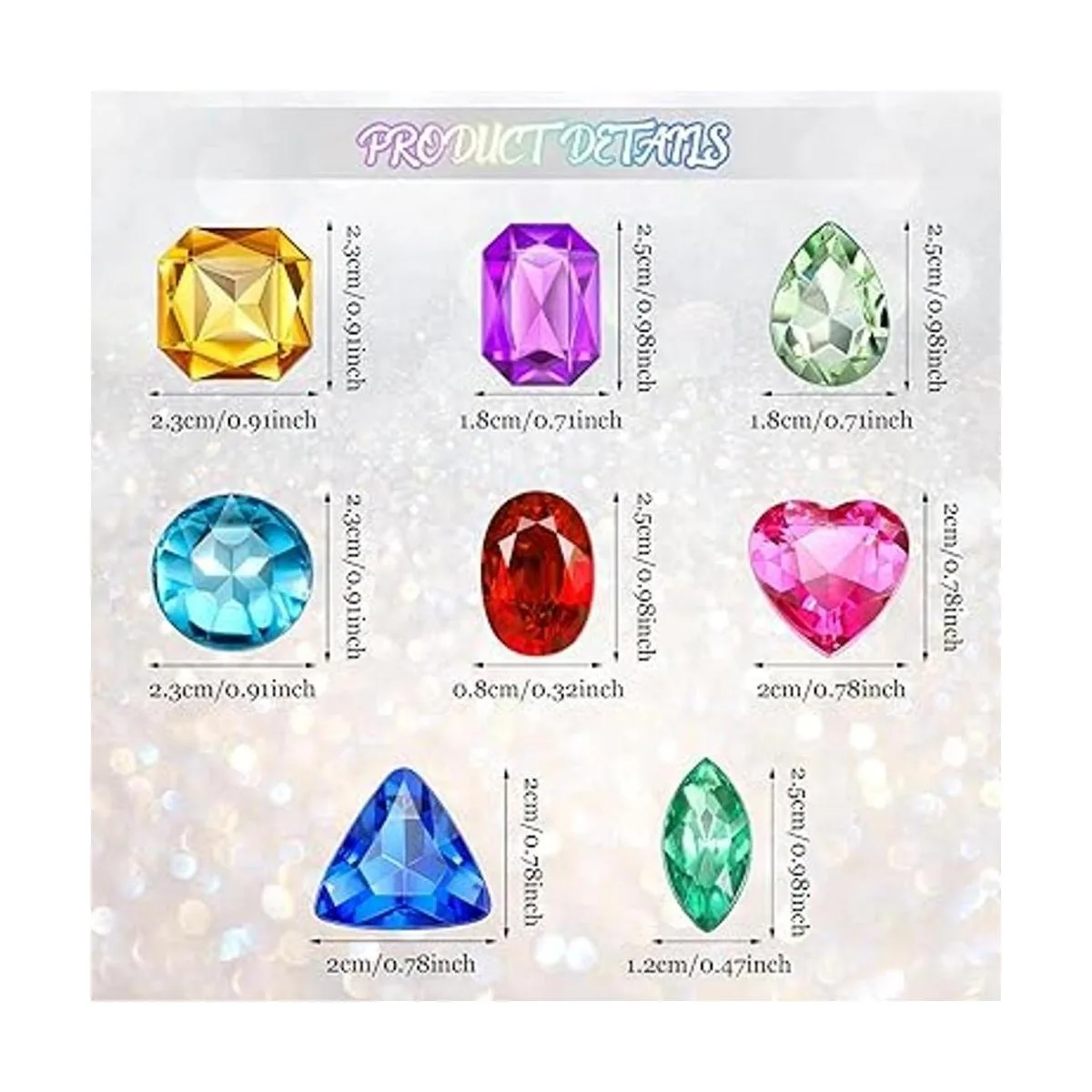 Tamaño y material: estos diamantes multicolor brillantes miden aproximadamente 0.81.2 in. Puedes consultar las imágenes para obtener la información específica del tamaño, hecho de plástico duradero y material de resina, no se decolora ni mantiene su brillo