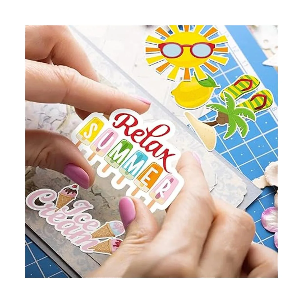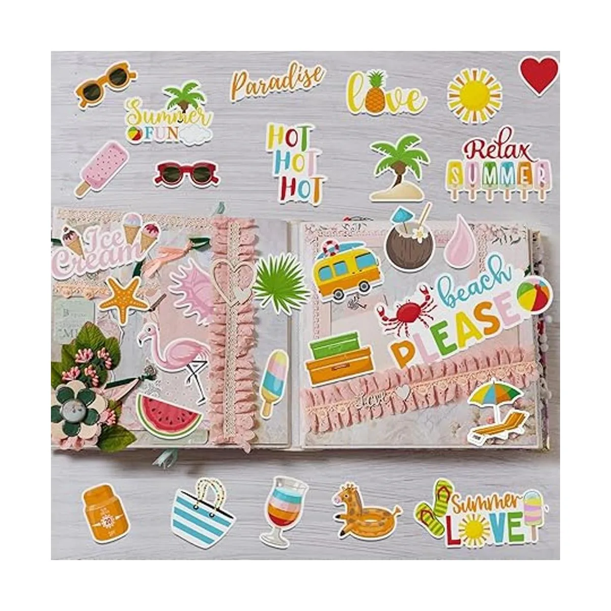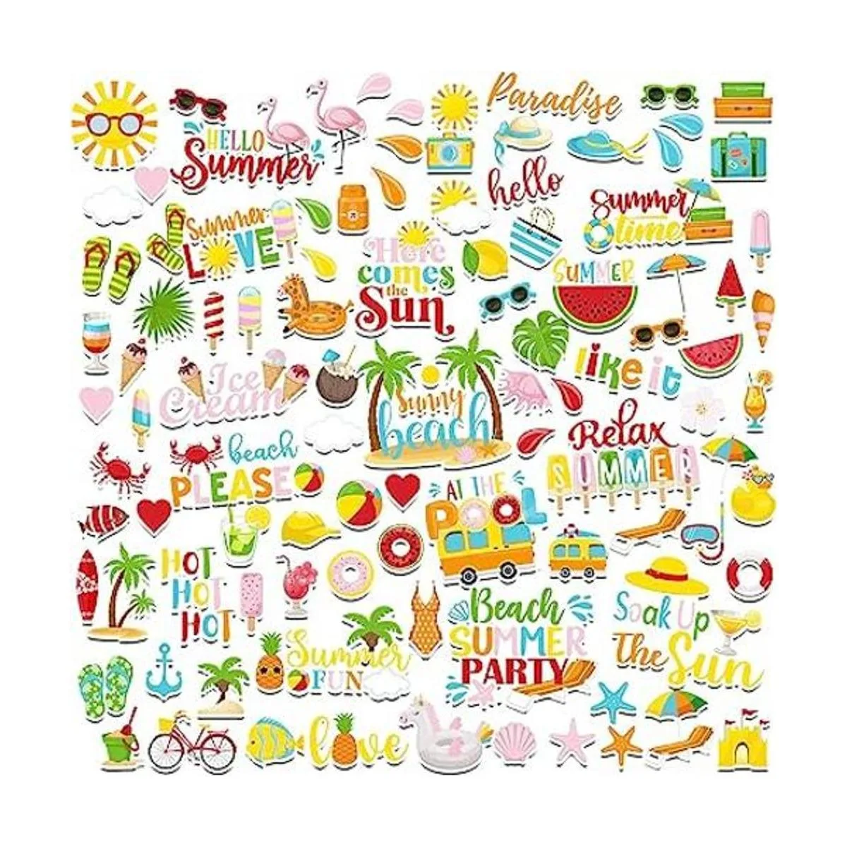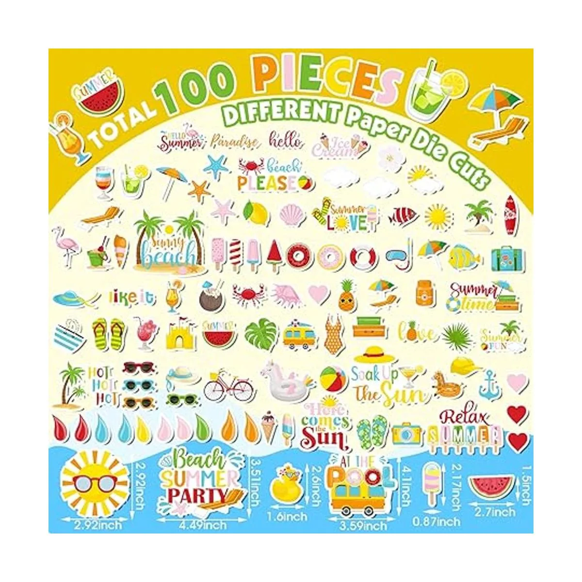 Troqueles de papel diversificados: recibirás 100 piezas de recortes de verano en diferentes estilos totalmente, adorables y divertidos; la cantidad suficiente y diseños de patrones surtidos pueden satisfacer tus necesidades de decoración de álbumes de recortes o reemplazo, y también puedes compartirlos con tus amigos circundantes