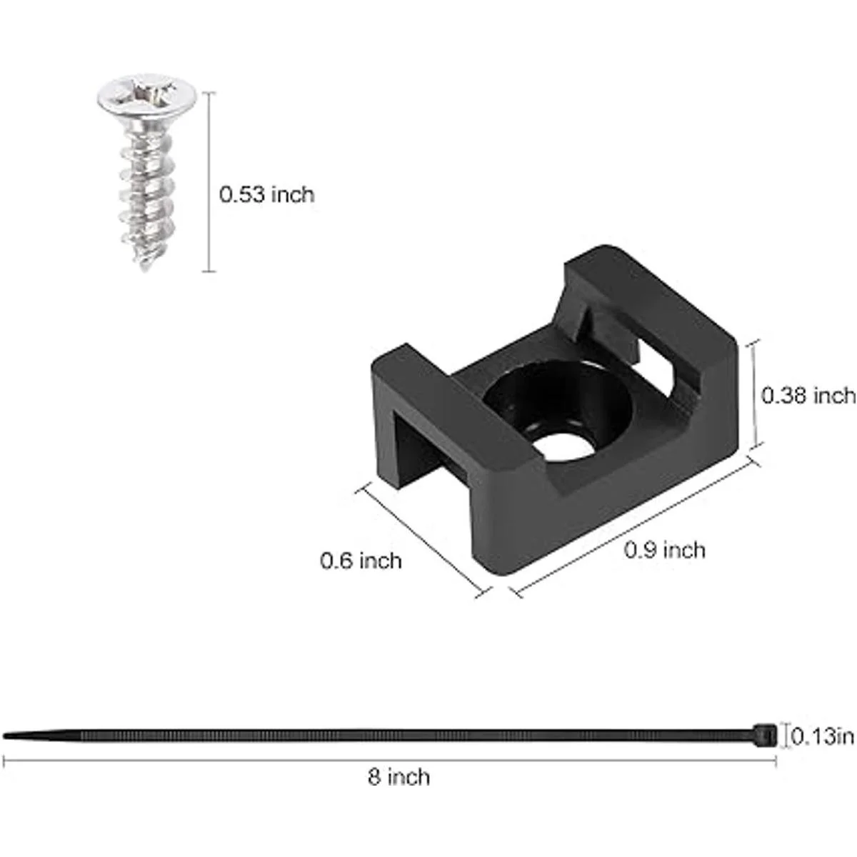 El paquete incluye: 100 bases de brida, bridas de cremallera de 100 x 8 pulgadas, 100 tornillos de rosca.