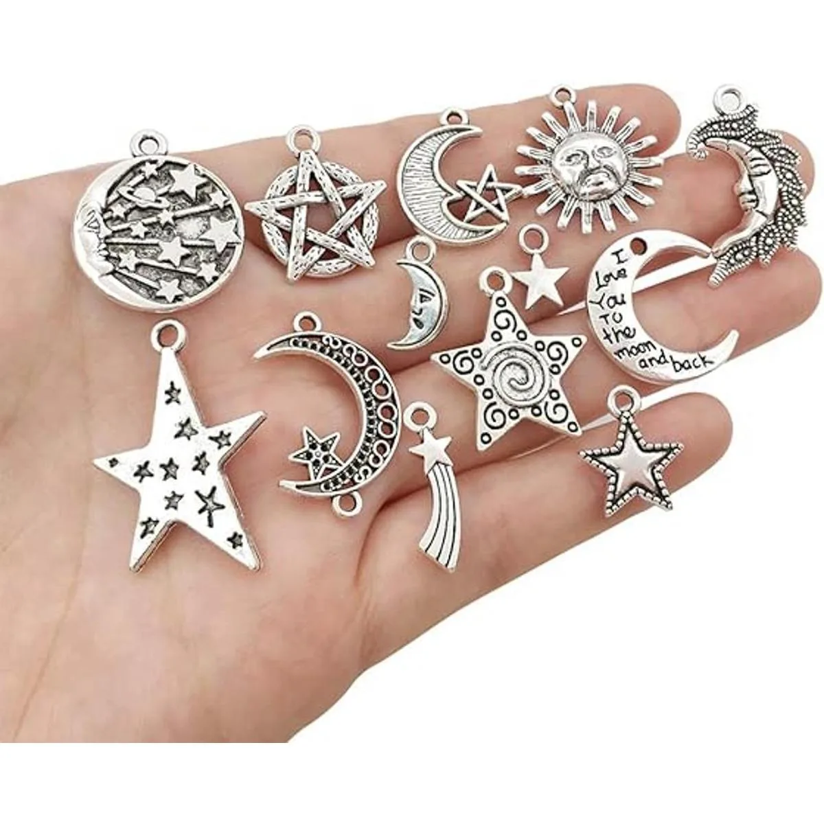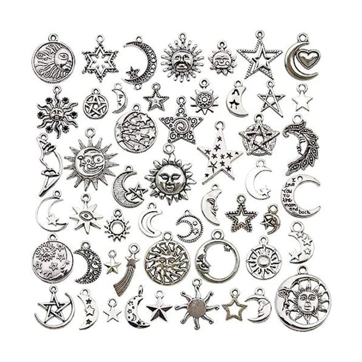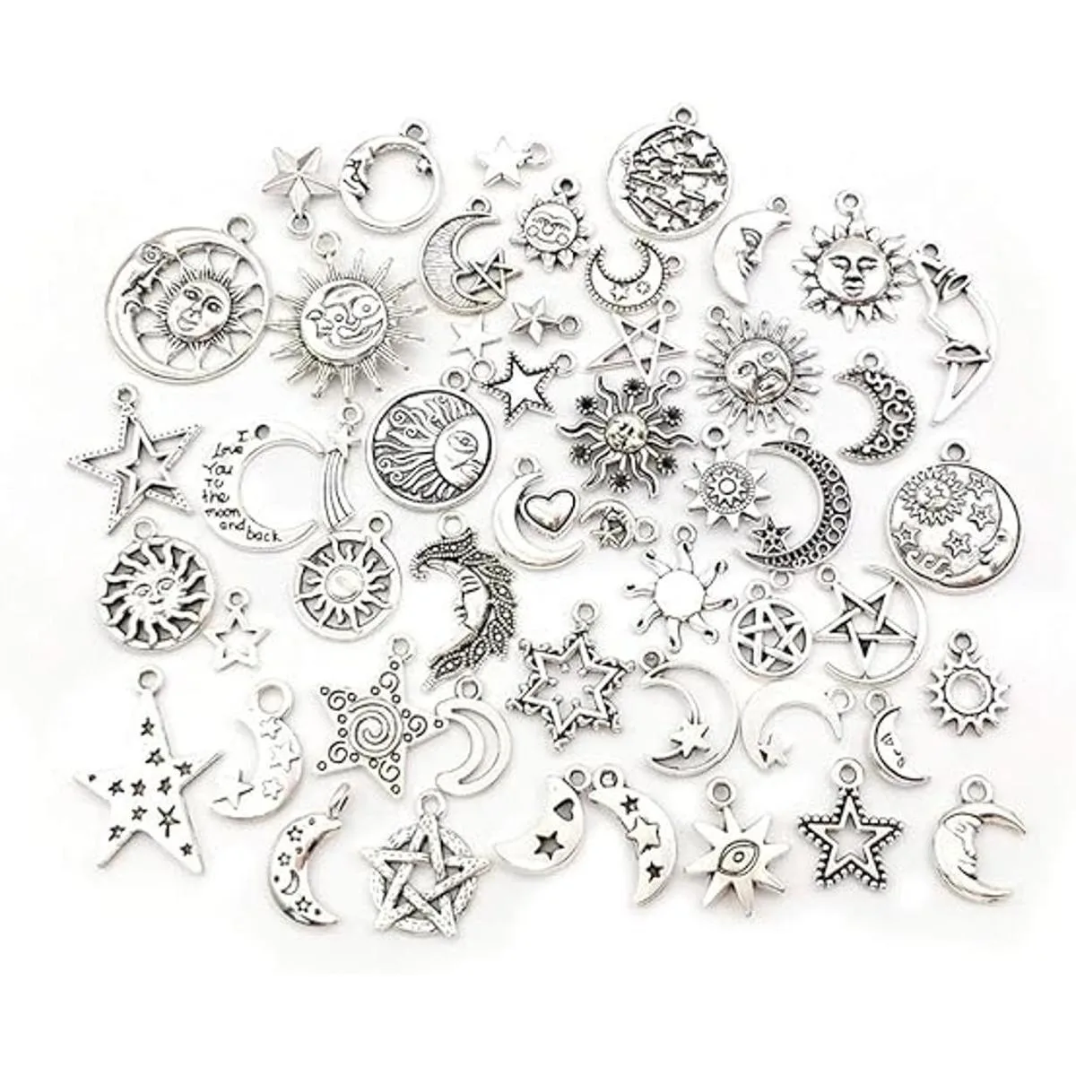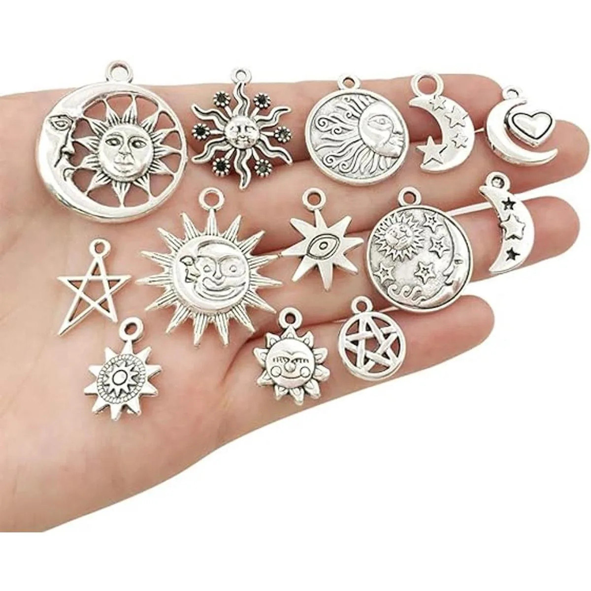 100 piezas de suministros de manualidades mixtos de plata antigua con sol, luna, estrellas, colgantes para manualidades, joyería, accesorios para hacer collares, pulseras M417