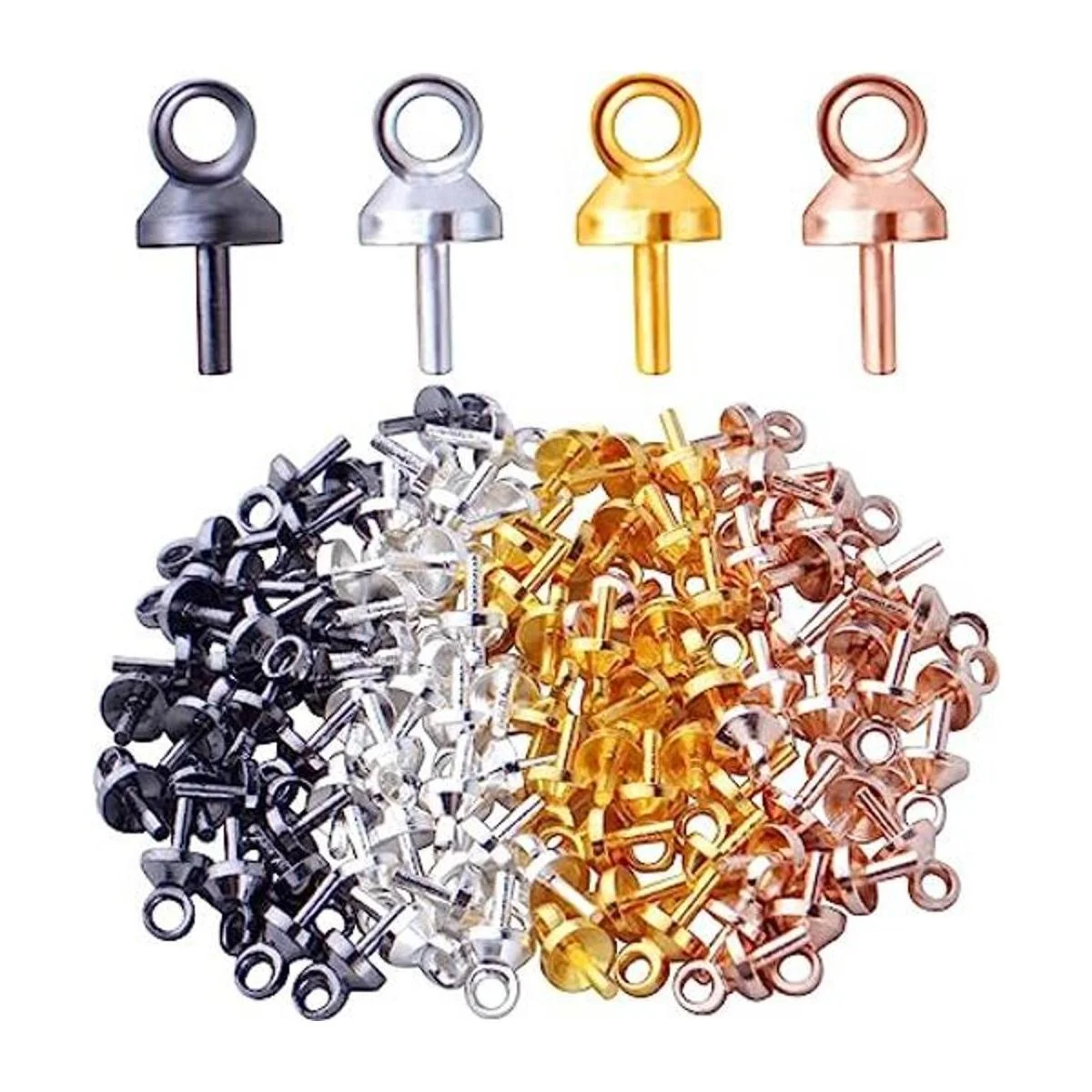 100 pines de acero inoxidable para vasos de ojo de perlas, colgantes de perlas de vaso pequeño, para hacer joyas, 4 colores, 0.295 in x 0.150 in, pin 0.035 in