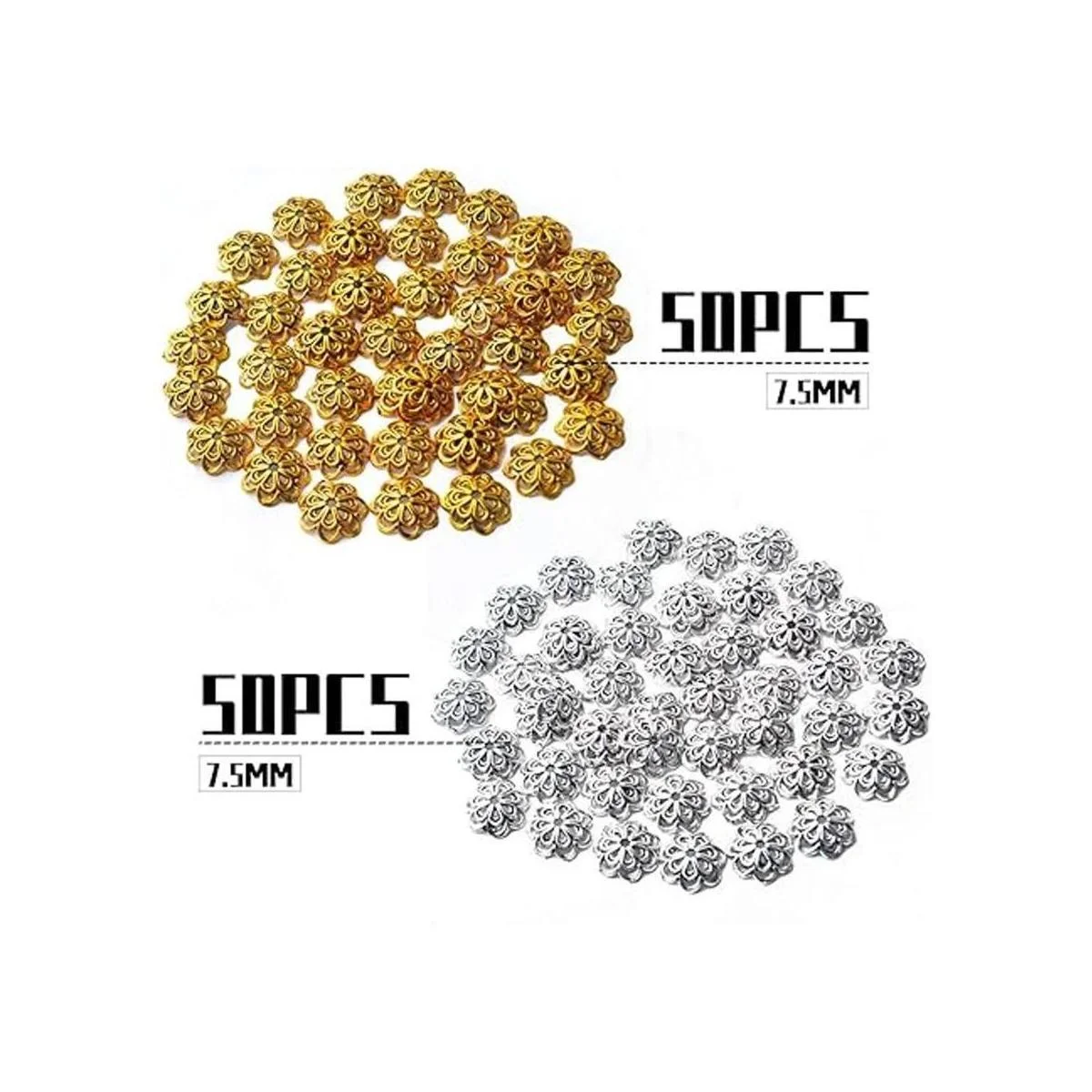 El paquete incluye: 100 tapas de cuentas de flores en total en el paquete, 2 colores oro antiguo y plata antigua, 50 unidades para cada color; el tamaño es de 0.295 in 0.142 in.