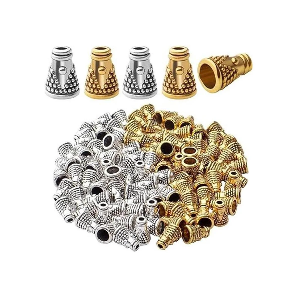 El paquete incluye: recibirás 100 tapas de cuentas cónicas en total, 2 colores oro antiguo, plata antigua, 50 unidades de cada color. Suficiente para tus necesidades de joyería.