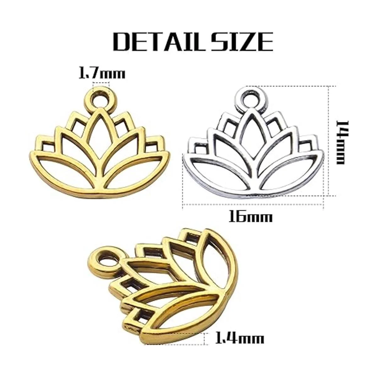 Cantidad suficiente: el paquete viene con 100 abalorios de loto en total, 2 colores oro antiguo y plata antigua, 50 unidades de cada color; el tamaño es de 0.630 in 0.551 in 0.055 in, el agujero del colgante: 0.067 in.