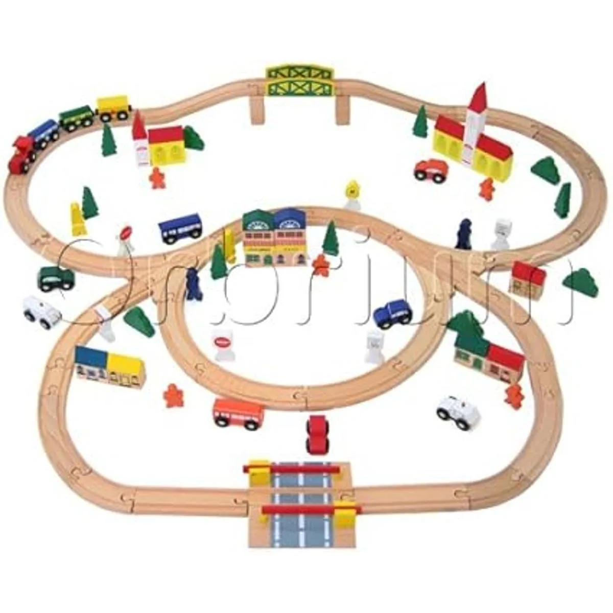 El juego viene completo con motores de tren y entrenadores, un puente, edificios de ciudad, vehículos de ciudad crucero de policía, ambulancia, coches y autobuses, señales de carretera, árboles, arbustos y figuras.