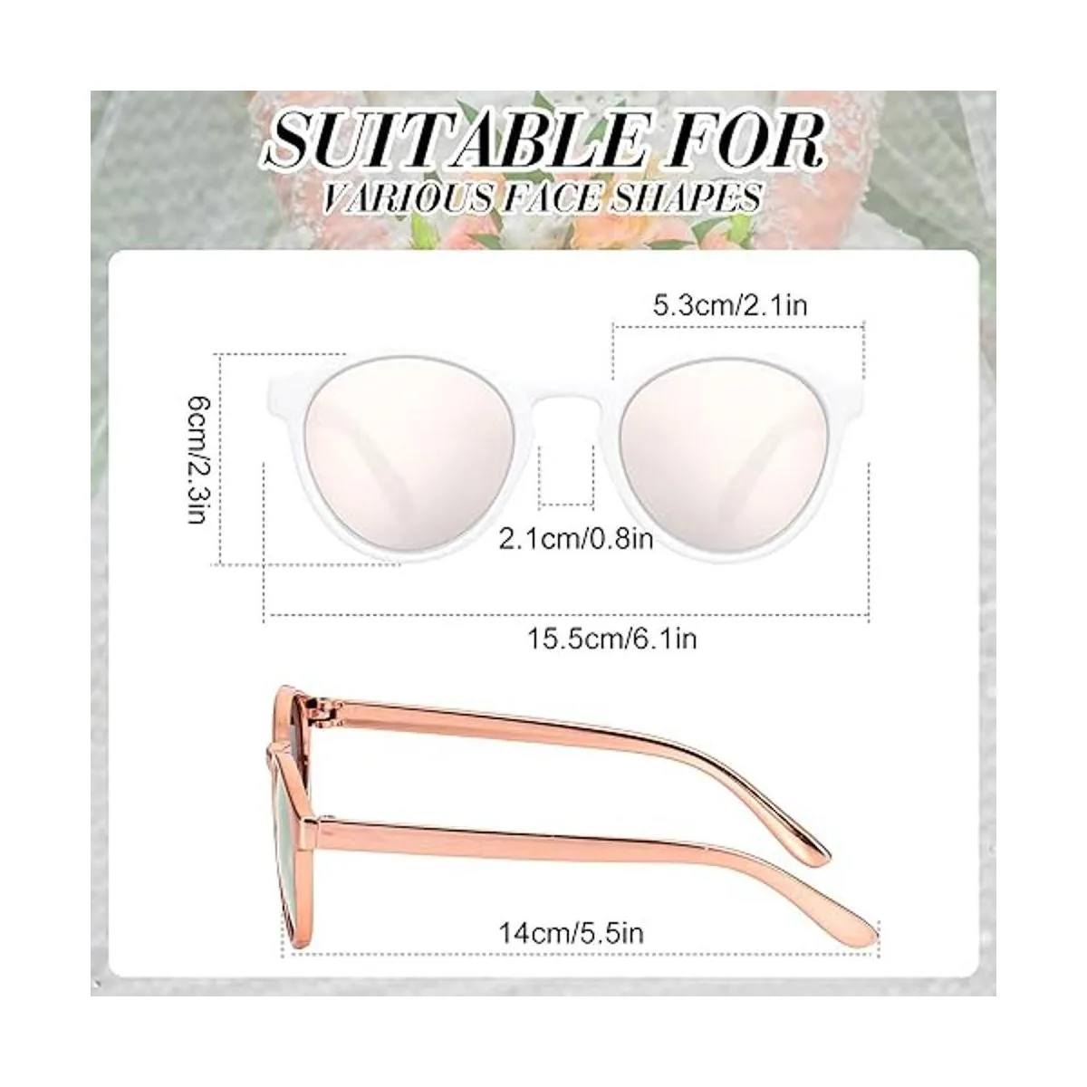 Detalles de las dimensiones: el ancho total de estas gafas de sol para fiesta de boda es de 5.2 in, la altura es de 1.9 in, el ancho de un solo marco para gafas es de 2.2 in, y la longitud de las patas de las gafas es de 5,43 pulgadas, lo que es adecuado para la mayoría de la gente; Por favor, Mide el tamaño antes de realizar un pedido