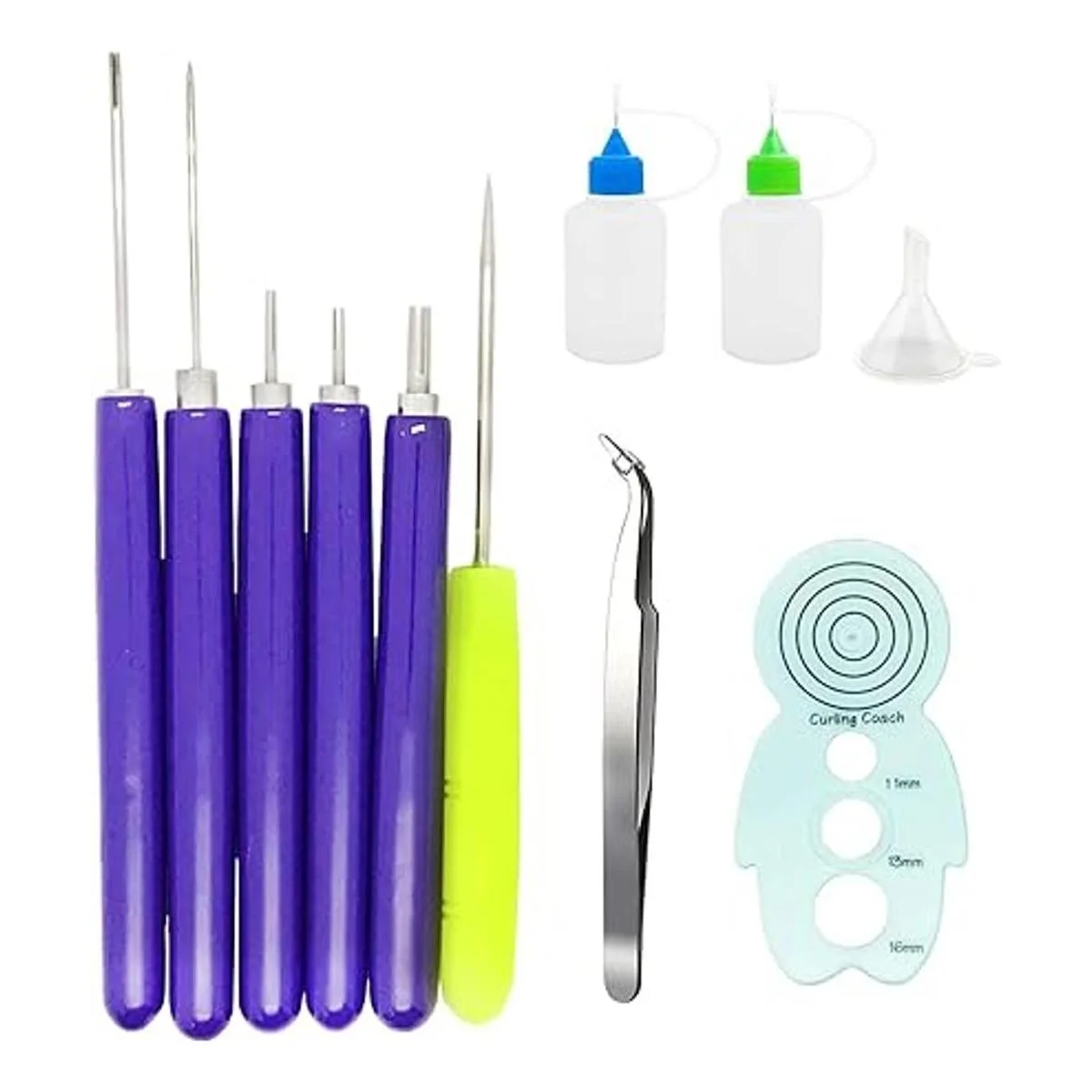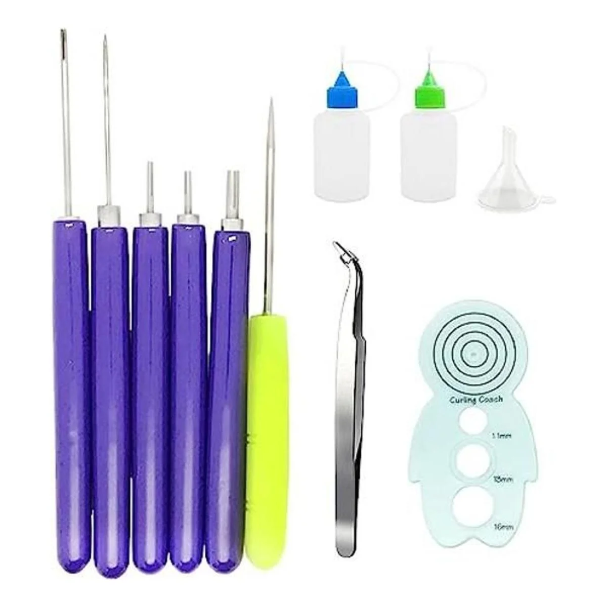 Recibirás: 2 botellas de aguja, 1 embudo pequeño, 1 entrenador de rizado, 5 herramientas ranuradas de diferentes tamaños, un punzón de color aleatorio y una pequeña pinza, 11 piezas en total.
