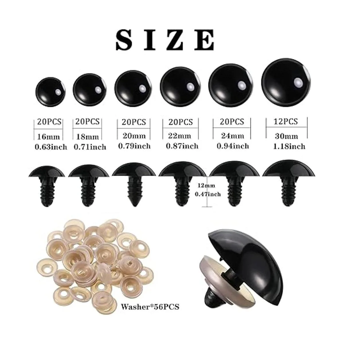 Cantidad y tamaño: hay 112 ojos de seguridad de plástico en 6 tamaños diferentes, 20 piezas en 0.630 in, 20 piezas en 0.709 in, 20 piezas en 0.787 in, 20 piezas en 0.866 in, 20 piezas en 0.945 in y 12 piezas en 1.181 in, cantidad suficiente y tamaños surtidos para satisfacer tus diferentes necesidades de bricolaje