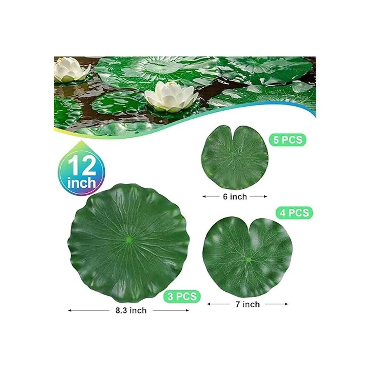 El paquete incluye: 12 hojas de lirio de simulación, un total de 3 tamaños, los diámetros son 3 de 8.3 pulgadas, 4 de 7 pulgadas, 5 de 6 pulgadas. Cantidad suficiente y diferentes tamaños pueden satisfacer tus diferentes necesidades de decoración.