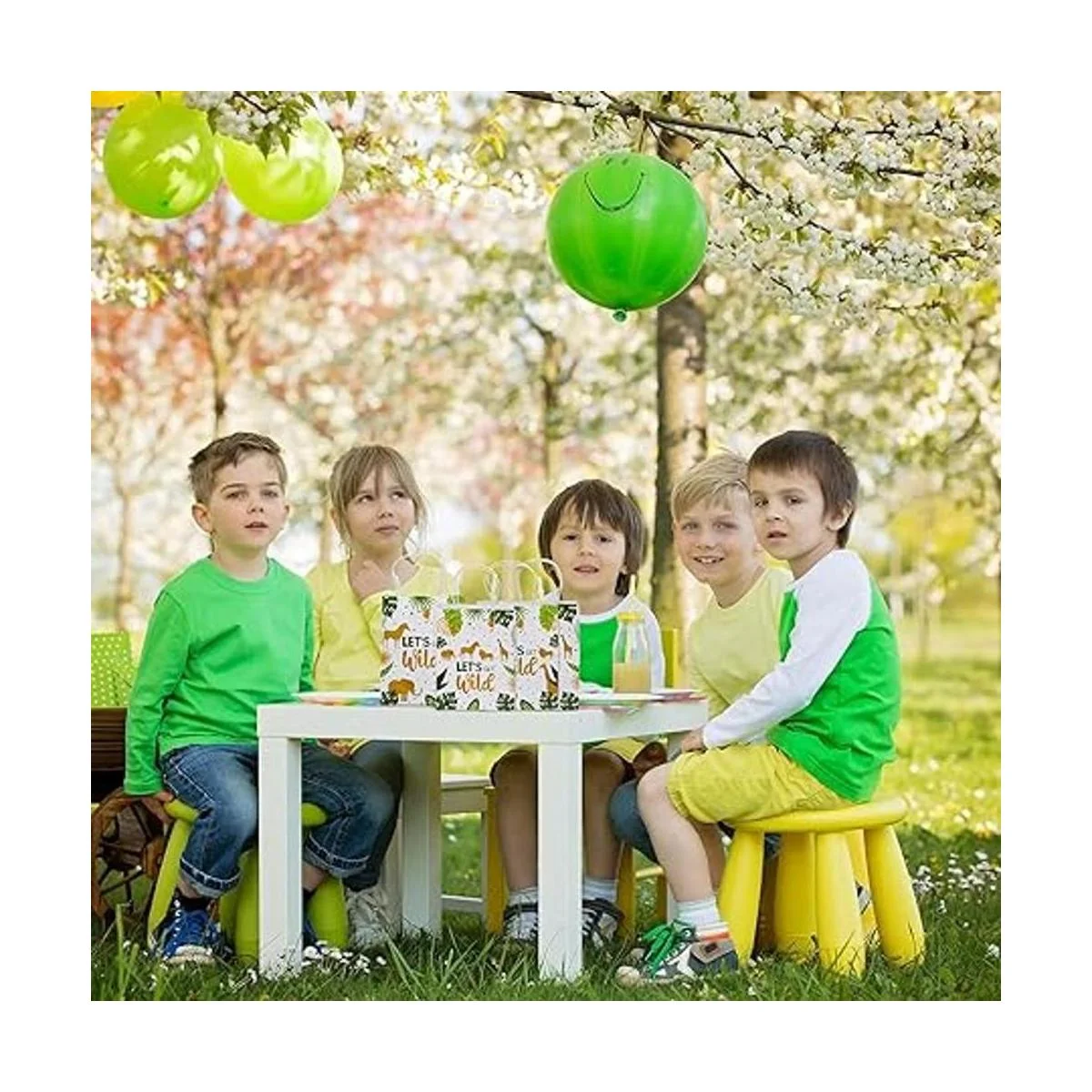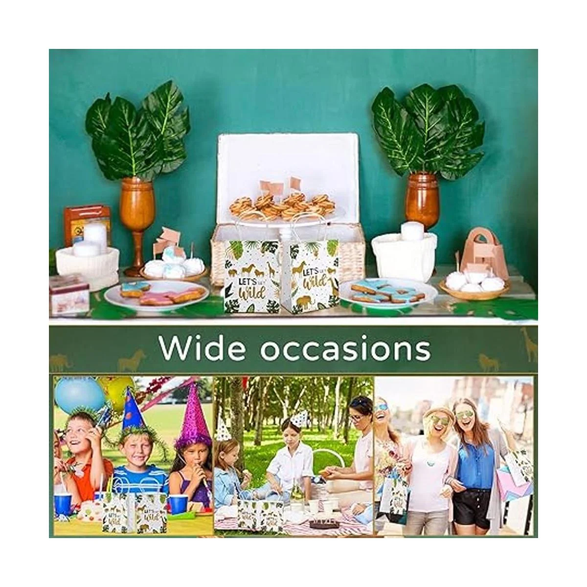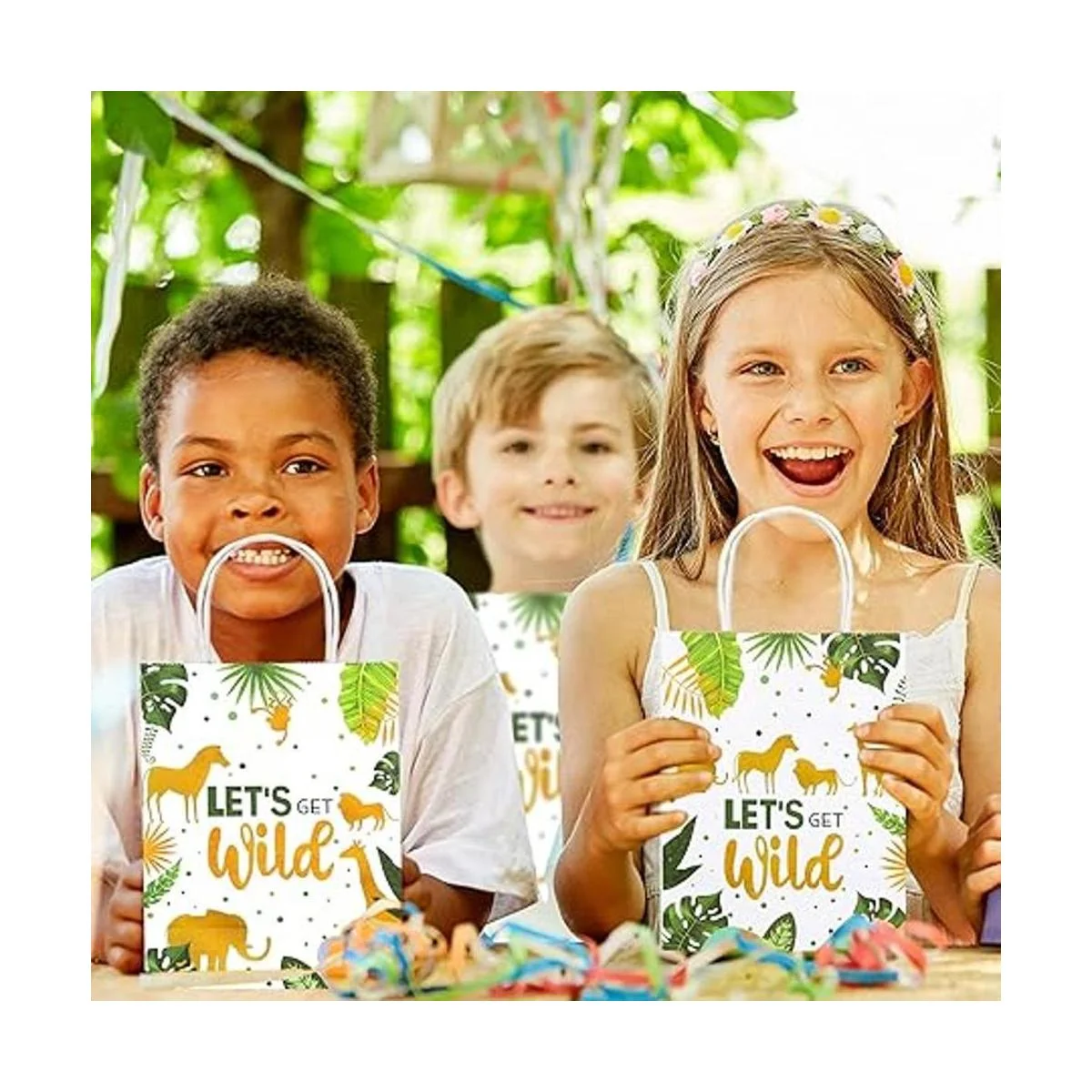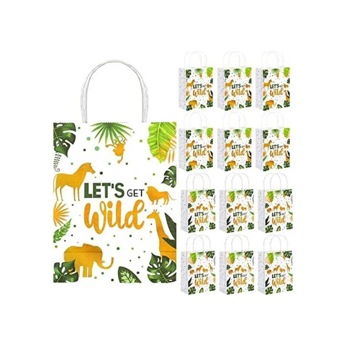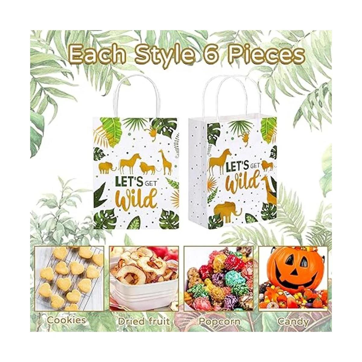 12 bolsas de regalo con temática de animales de la selva, bolsas de papel safari, bolsas de dulces con asas de oro verde, suministros de fiesta para fiestas de cumpleaños, bodas, fiestas de cumpleaños