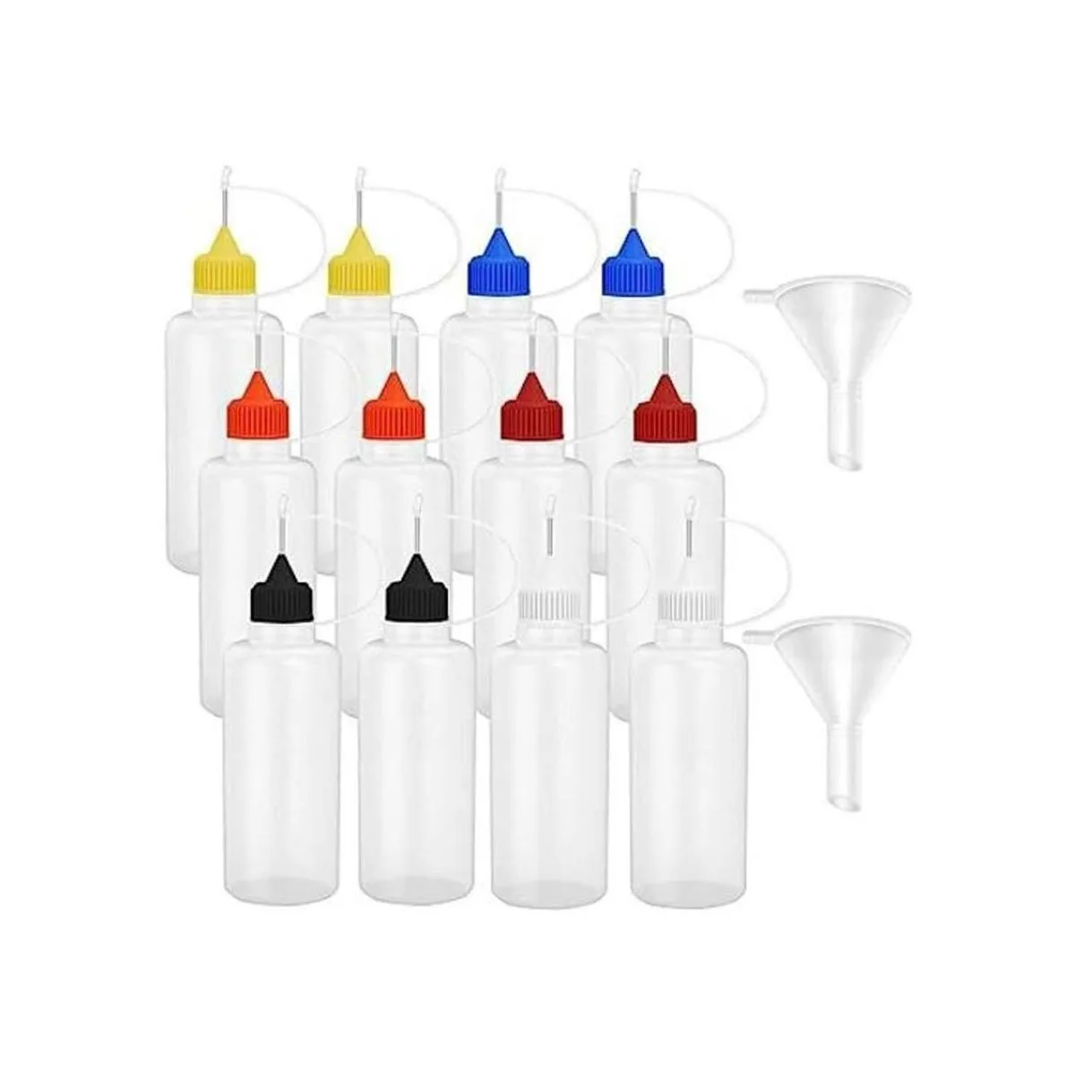 Botellas de pegamento con punta de aguja: 12 botellas aplicadoras de tapa multicolor de 1.6 pulgadas, altura de 5.6 pulgadas, puede contener 4 onzas de líquido, con embudo que te permite llenarlas fácilmente, perfectas para aplicar en piezas intrincadas y trabajos de detalle.