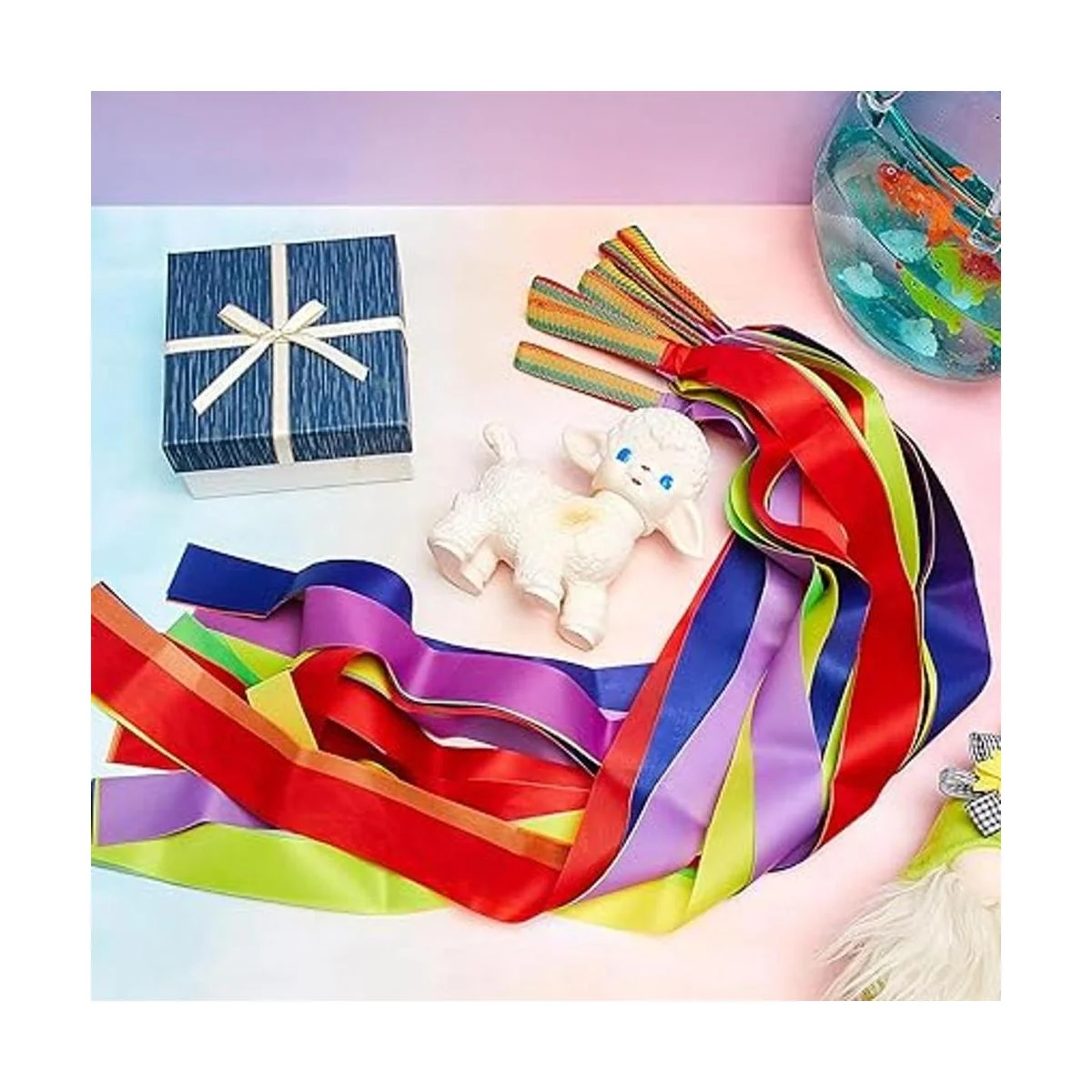 Información sobre el tamaño: cada cinta mide 39.4 pulgadas de largo, con un mango sólido y 6 cintas de diferentes colores, el tamaño del mango de la cinta es muy adecuado para muñecas de niños y se puede girar y bailar como desees