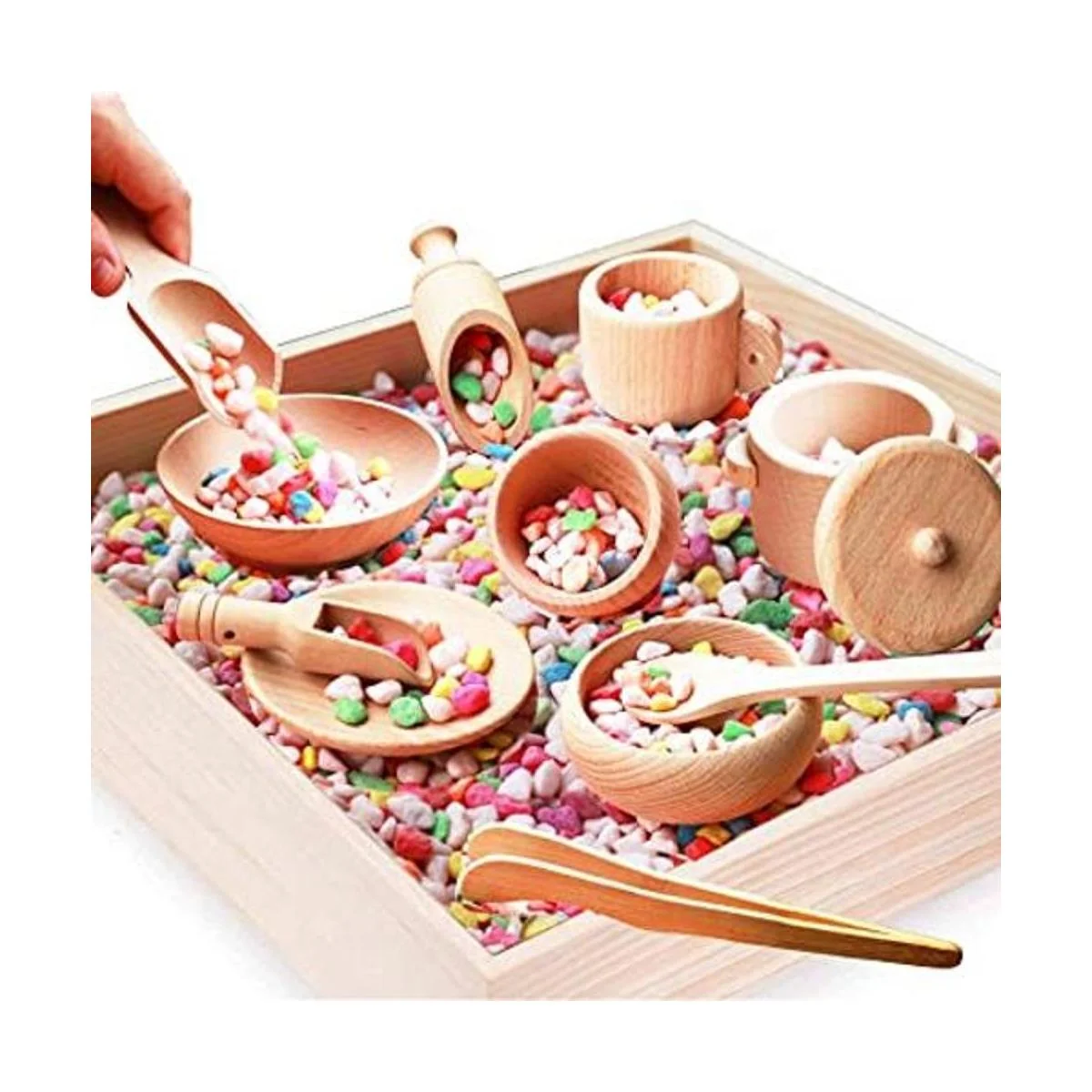 Una caja de madera para herramientas sensoriales: incluye un contenedor sensorial de madera para que tus hijos almacenen 11 juguetes de madera sensoriales, los niños pueden verter granos, frijoles, avena, arroz, rocas, arena y otras partículas en esta caja de madera, y utiliza las herramientas de contenedor sensorial para verter, transferir, recoger y apilar, practica utilizar las herramientas de cocina, trae la alegría de la vida real a los niños