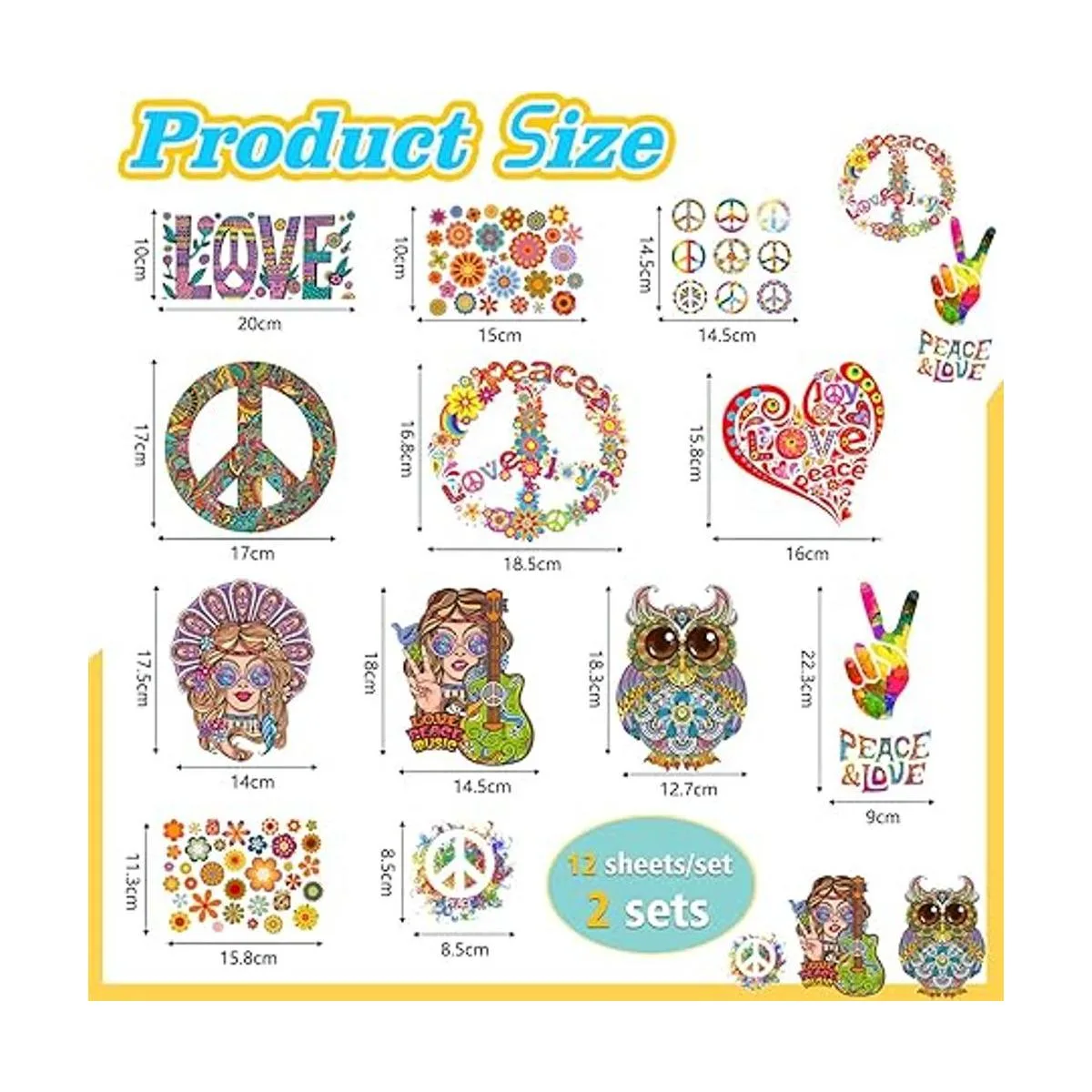 Información del paquete: recibirás 12 hojas de parches de transferencia de calor hippie para mujeres, están en bonitos patrones y colores brillantes, que pueden ser atraídos por tus hijos y tú; la cantidad suficiente puede satisfacer tus necesidades de bricolaje
