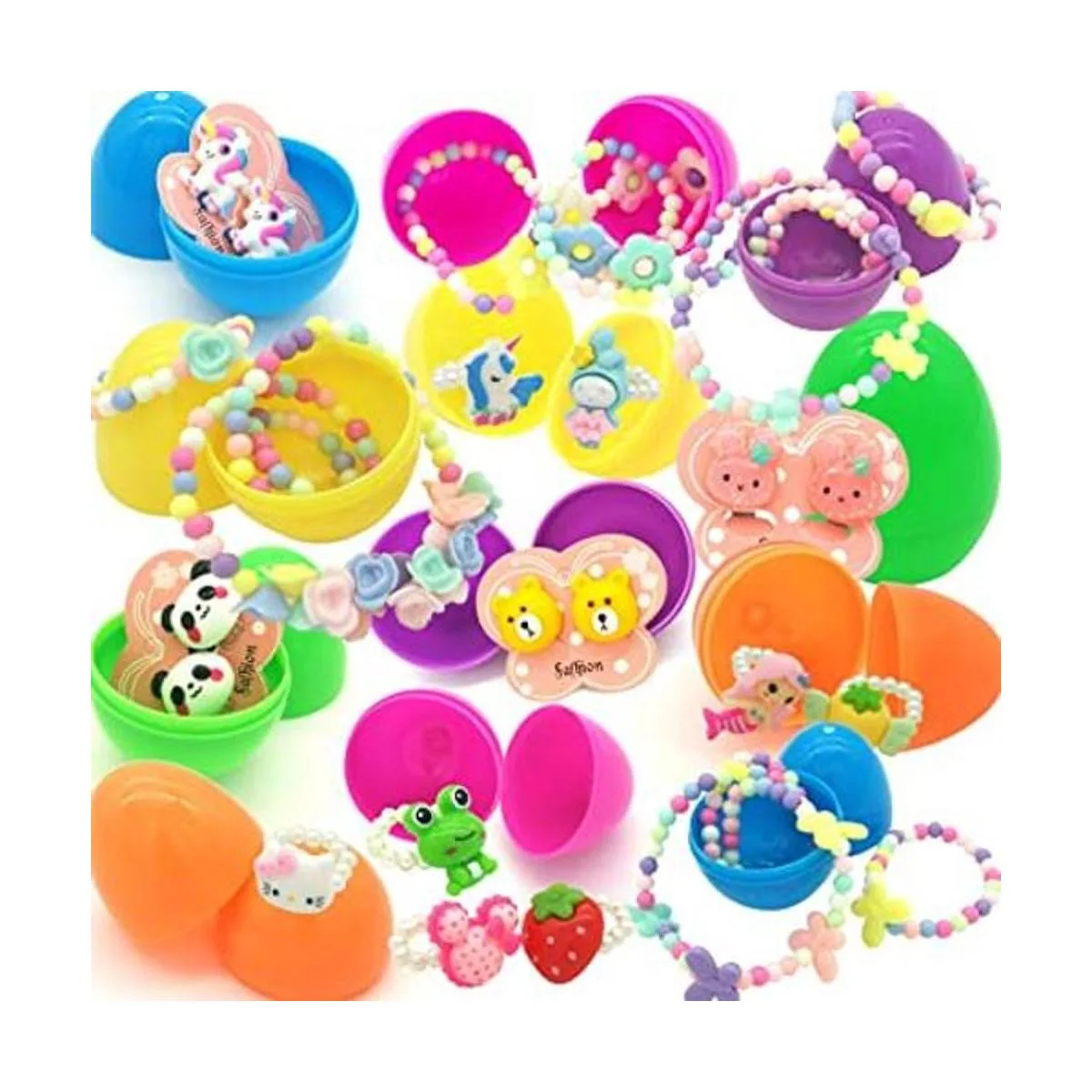 12 huevos de Pascua prerellenos con 24 juguetes sorpresa de joyería de imitación para niñas, huevos de Pascua de plástico rellenos con collares, pulseras, anillos, aretes para rellenar cestas de Pascua, caza de huevos de Pascua, premio de aula