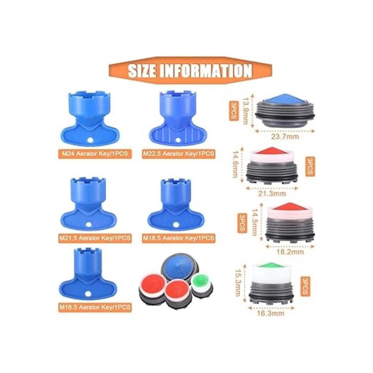 Cantidad y tamaño: tamaño de los aireadores de grifo: 0.642 in, 0.717 in, 0.839 in, 0.933 in, 3 piezas para cada tamaño, 12 piezas en total, con 5 herramientas de llave de extracción de llave aireadora de grifo, cantidad suficiente para satisfacer tus necesidades
