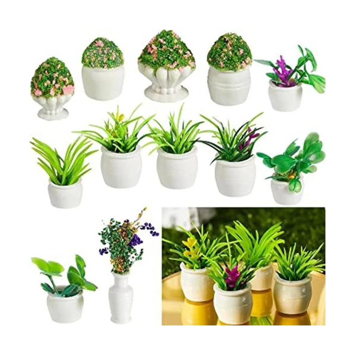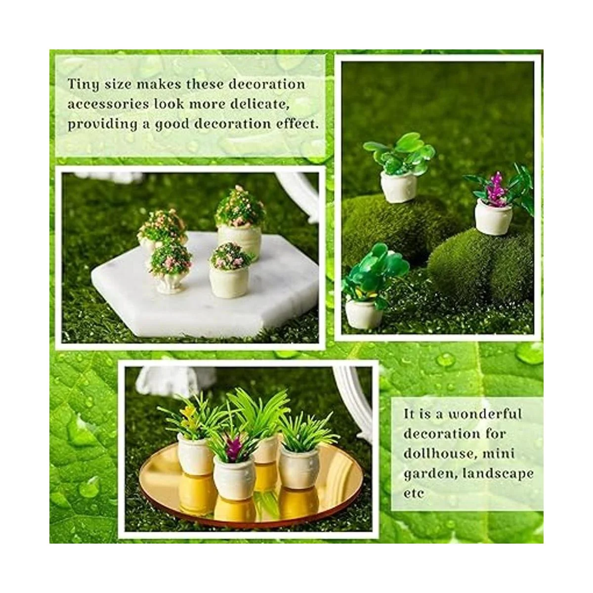 Diversos usos: estas mini plantas en maceta son agradables para exhibir en la mesa, escritorio de oficina, mesita de noche, estantes, armarios, alféizar de la ventana, chimenea chimenea, mesas de café, mesa de comedor, tanque de inodoro, encimera, estantería o cualquier otra esquina pequeña que necesite vegetación, añadiendo más decoración para tu casa de muñecas