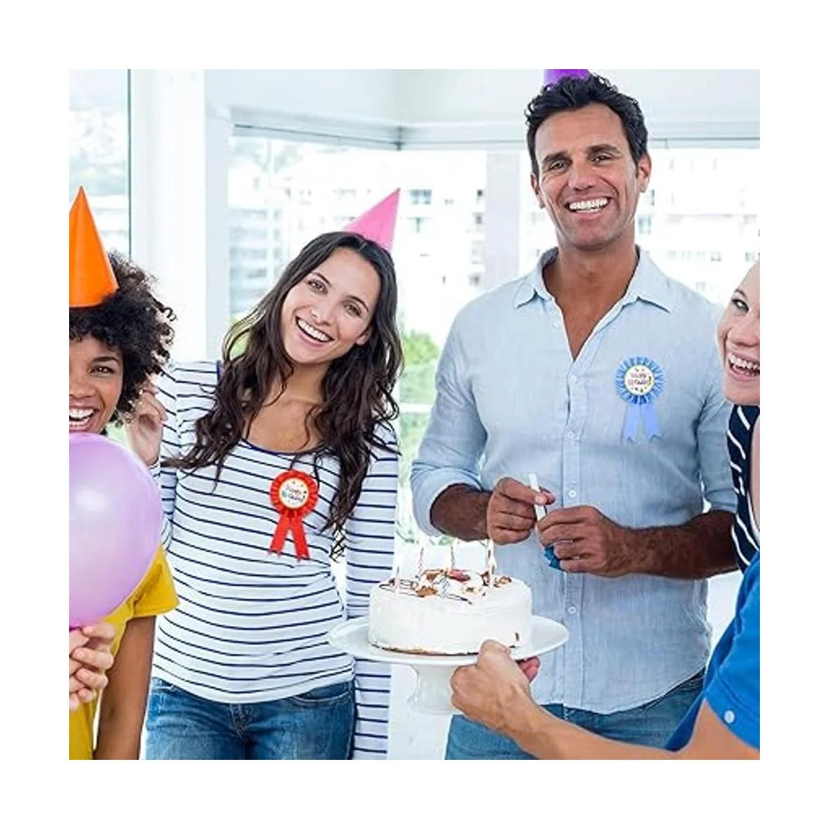 Material de calidad: esta cinta de premio de cumpleaños está hecha de material de hojalata de calidad con cintas llamativas, fiable y reutilizable, segura y ligera, cuidadosamente elaborada, con pin de acero inoxidable para fijarse fácilmente en bolsillos, cinturones u otros tejidos