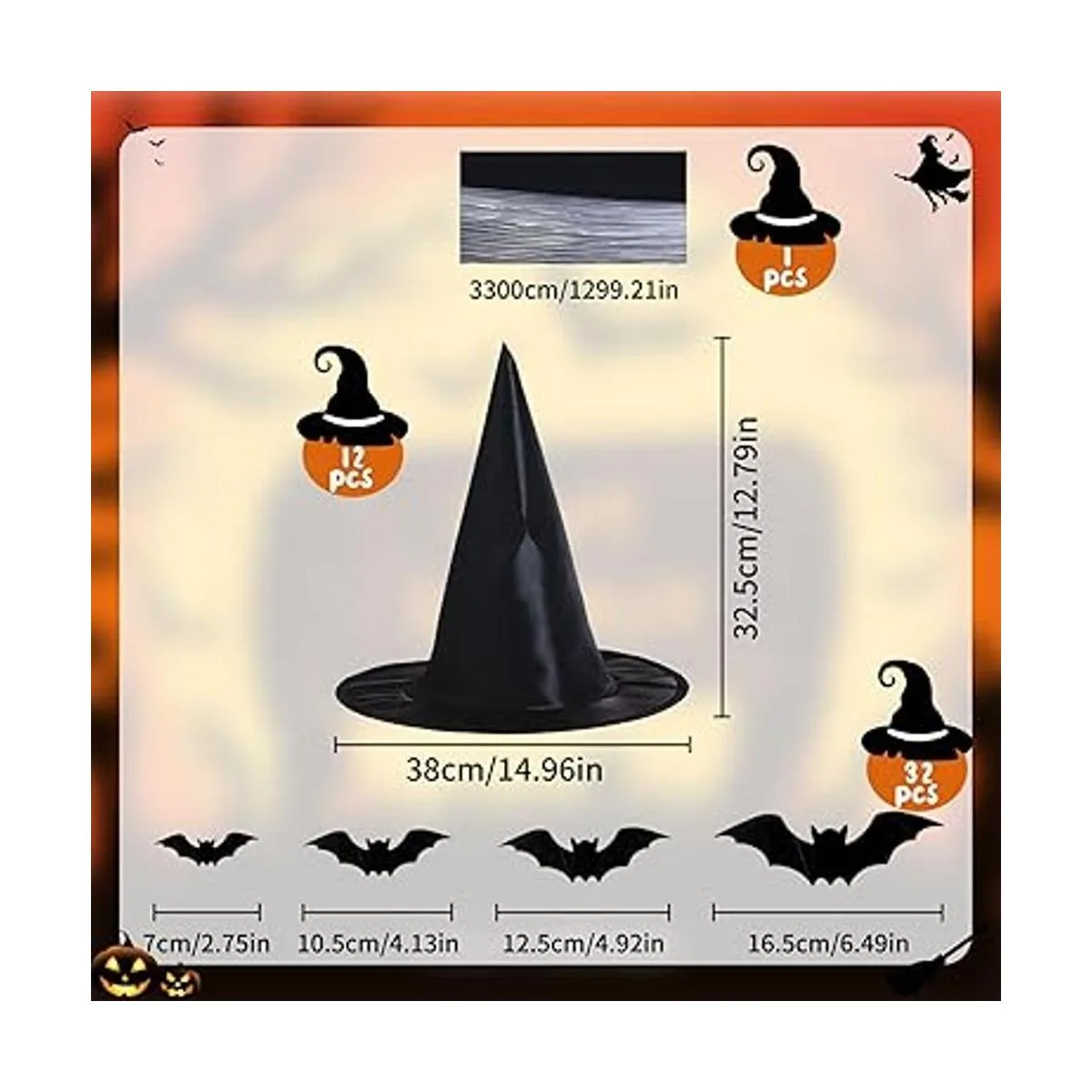 Decoración de sombreros de bruja: este juego de bruja contiene 12 sombreros de mago, 1 rollo de línea de pesca de hasta 108.3 ft de largo, 32 murciélagos 3D. Añade un toque extra a tus decoraciones de Halloween.