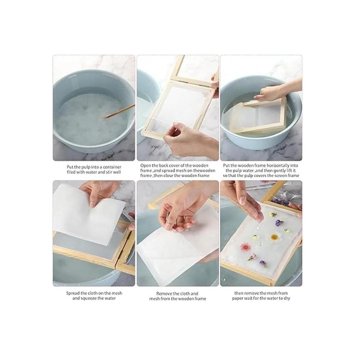 Modo de empleo: utilizar con madera original o pulpa de tela o papel reciclado no brillante, en el proceso de fabricación de papel, puedes decorar el papel con flores secas, hojas planas, tintas, pinturas acrílicas o papel reciclado de color. Cuando termines de hacer papel, limpia el marco de madera y la malla y colócalo en un lugar seco