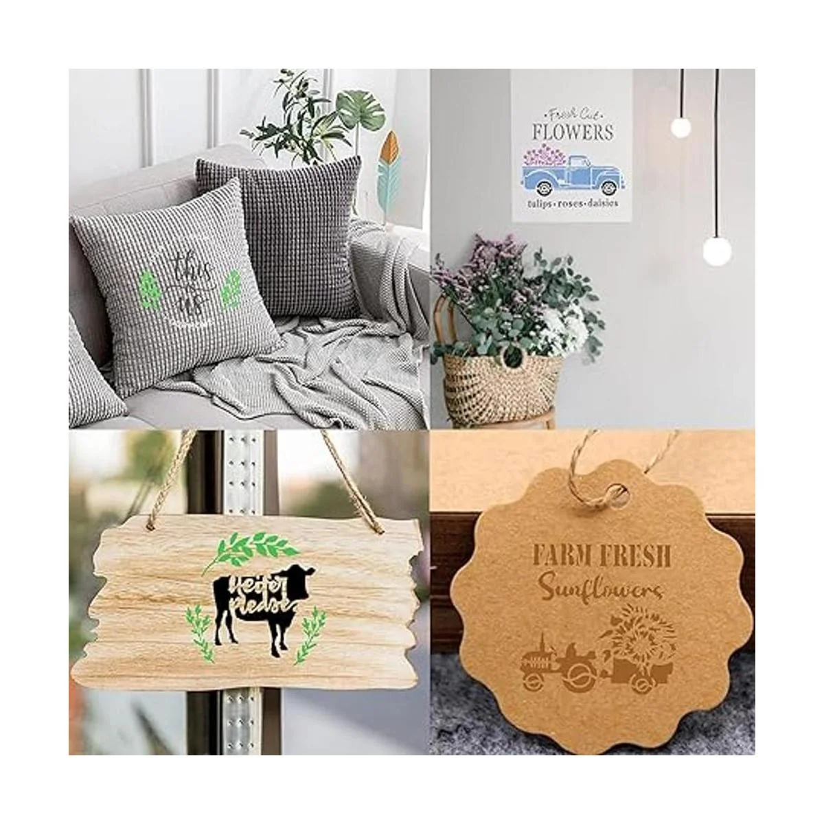 Amplio uso: estas plantillas de granja son ideales para muchos proyectos, se pueden utilizar en cartón, lienzo, vidrio, roca, camisetas, carteles, papel, pizarra, cerámica, vinilo, manualidades de pintura, decoración de granja, etc. También puedes utilizar pinturas acrílicas, herramientas de combustión, spray de aire y pinceles pequeños en la mesa, armario. Muy adecuado para porche de puerta delantera, carteles de madera, cumpleaños, Acción de Gracias o regalos de espectáculo de vacaciones, reza por pintar.
