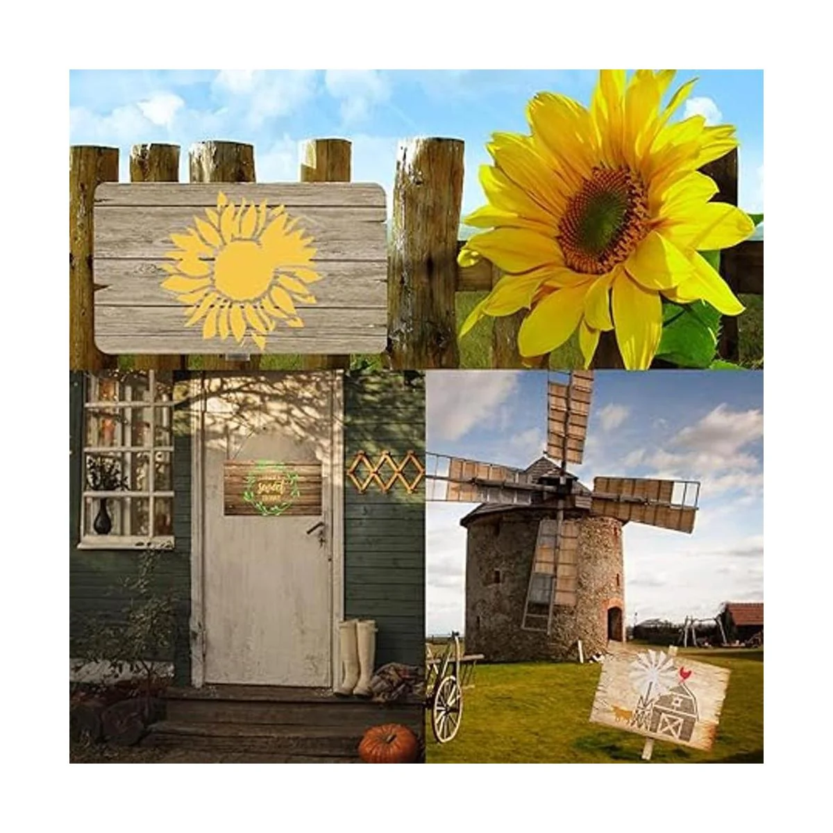 Plantillas temáticas de granja: estas plantillas utilizan diferentes diseños naturales y de granja para satisfacer tus necesidades, como letreros de letras de granja, dulce hogar, estos son nosotros, girasol, hierba, tractor vintage, molino de viento, cerdo, vaca lechera, oveja, animal de pollo, etc., puedes mezclarlas en diferentes combinaciones para decorar tu casa, cocina, jardín y pared rústica de granja, o el título colocado entre fotos en tu galería, deja que se vuelvan más hermosas.