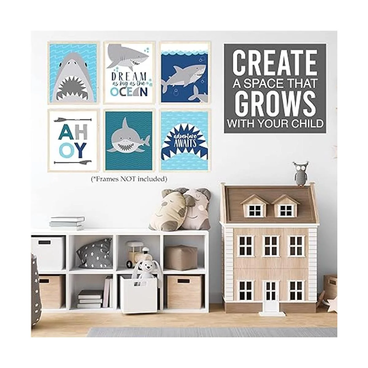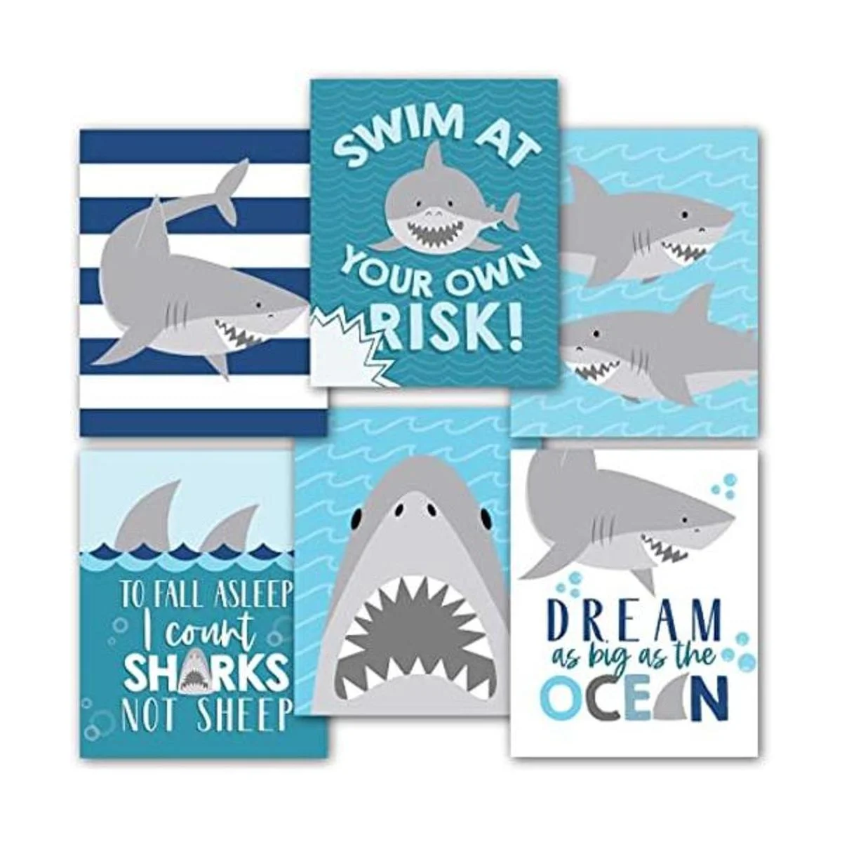 Crea un ambiente alegre para construir recuerdos; utiliza esta decoración de habitación infantil para niños para crear un ambiente positivo y divertido; estas impresiones de póster de tiburón son ideales para usar como decoración de niños o decoraciones de tiburón para cumpleaños y suministros de fiesta de cumpleaños de tiburón.